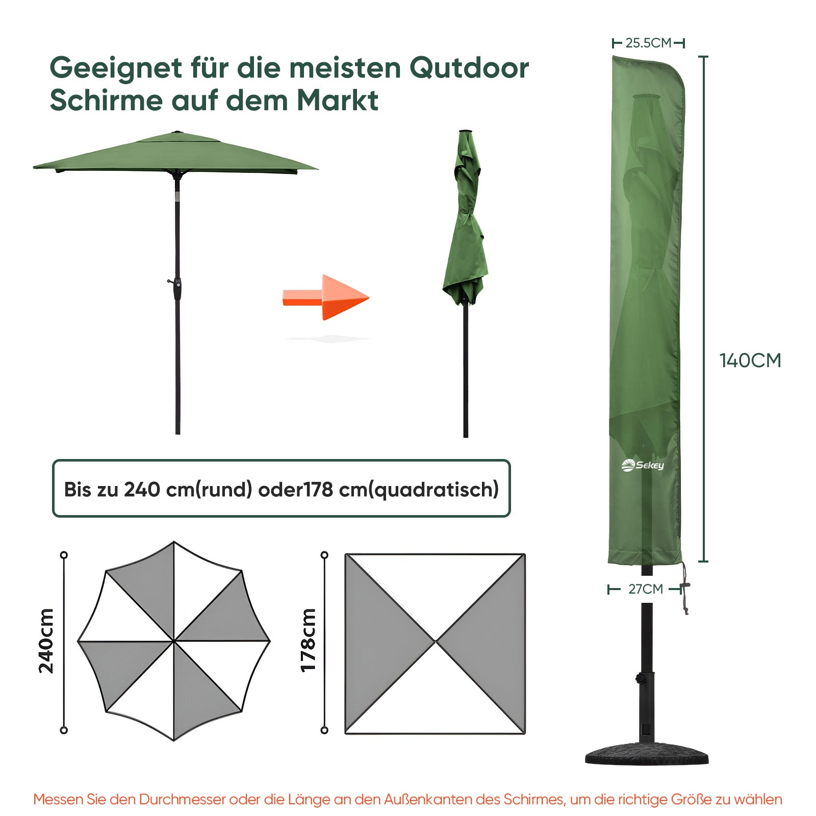 Multi-size compatibility: Our parasol cover (140 x 25.5/27 cm) fits perfectly for various sizes up to Ø 200 cm, 200 cm x 150 cm and 200 cm x 125 cm parasols.