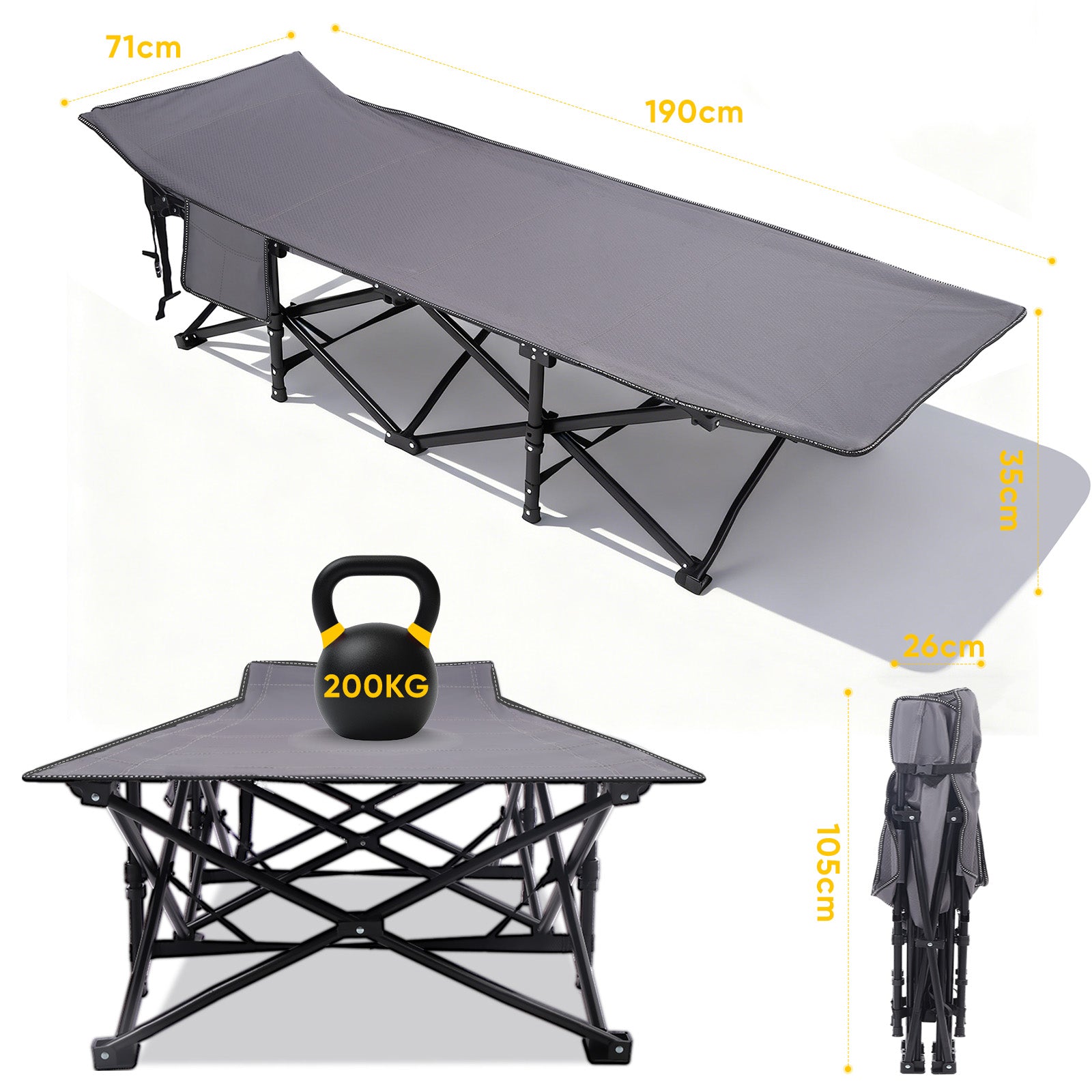 Der stabile Stahlrohrrahmen trägt bis zu 200 kg und überzeugt mit verstärkten Gelenken sowie rutschfesten, bodenschonenden Füßen. Das doppellagige 1200D Oxford-Gewebe ist wasserabweisend, extrem reißfest und einfach zu reinigen – perfekt für Outdoor-Einsätze bei jedem Wetter.