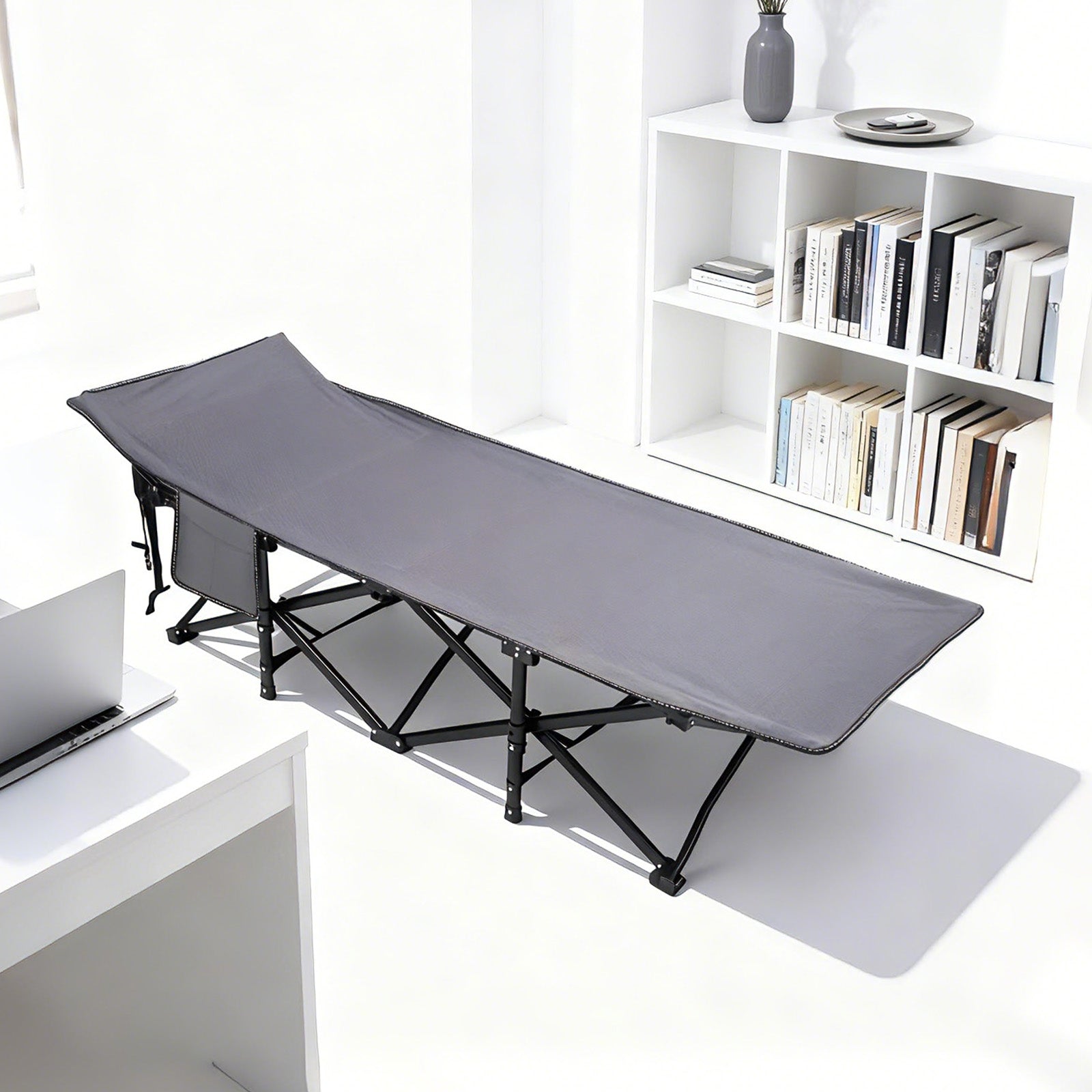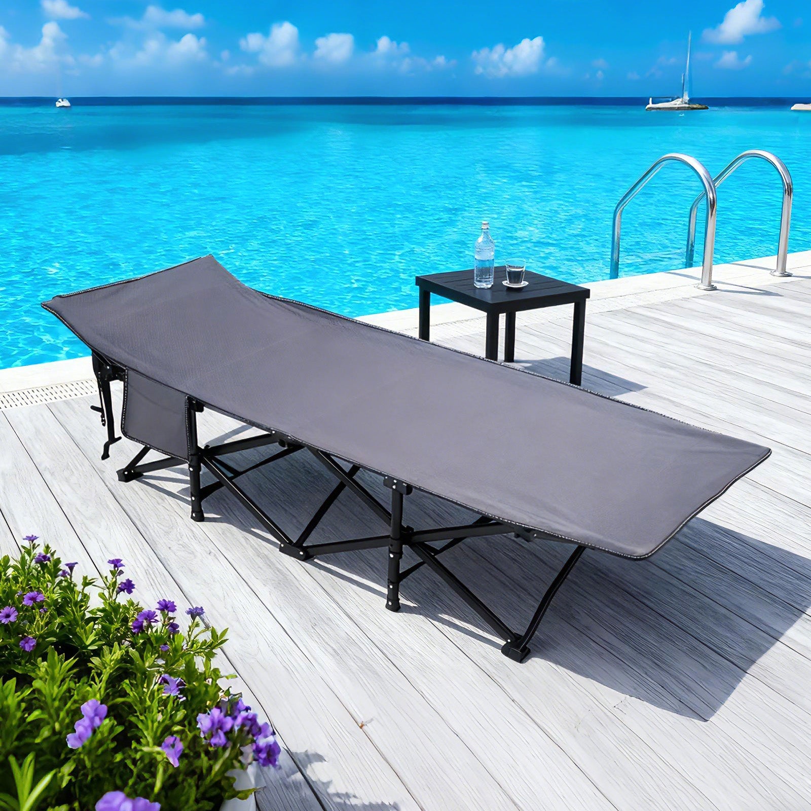 In nur wenigen Sekunden einsatzbereit, komplett montagefrei und kompakt zusammenfaltbar. Die praktische Seitentasche bietet Platz für Handy, Getränke und kleine Accessoires – jederzeit griffbereit.