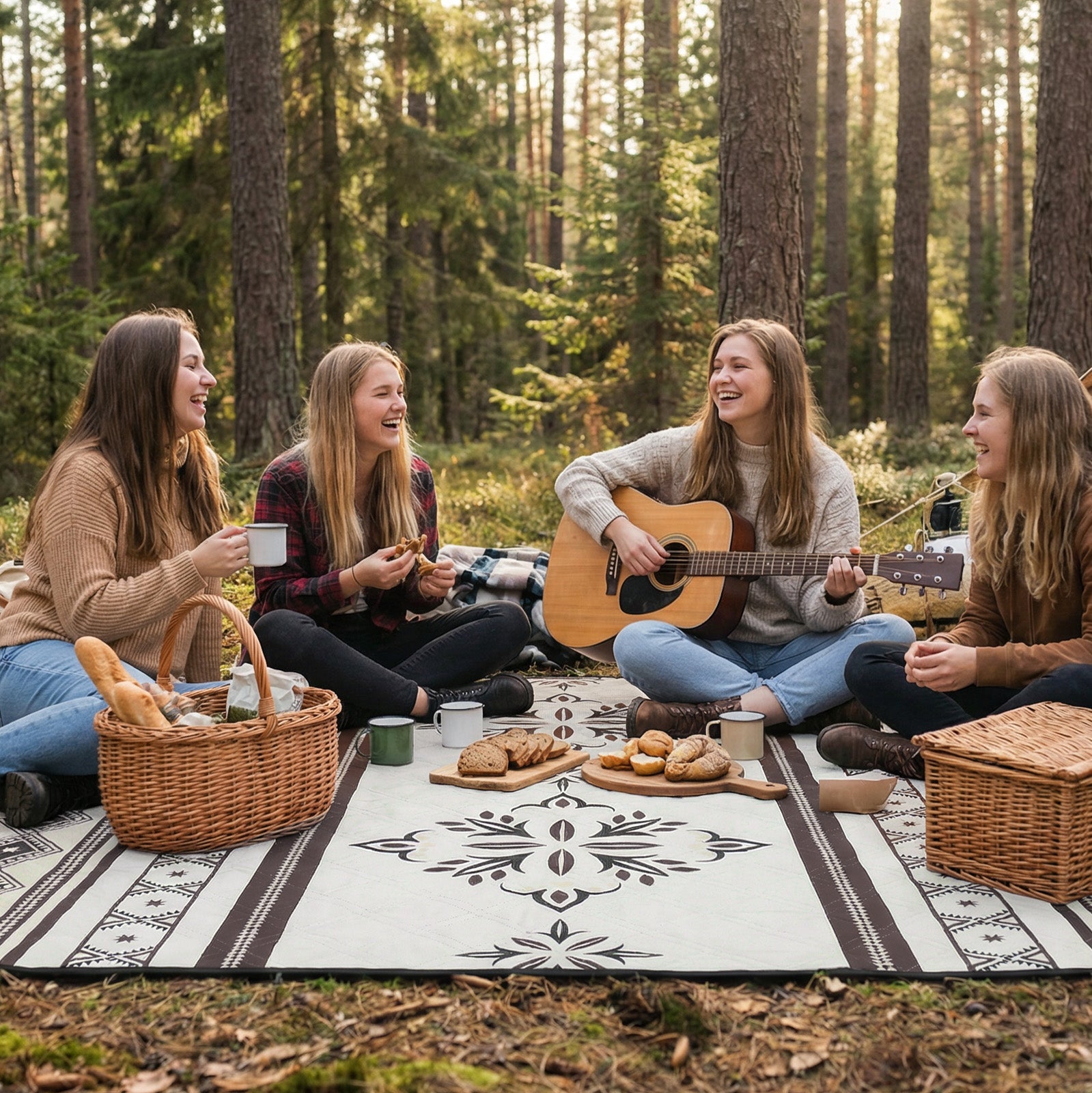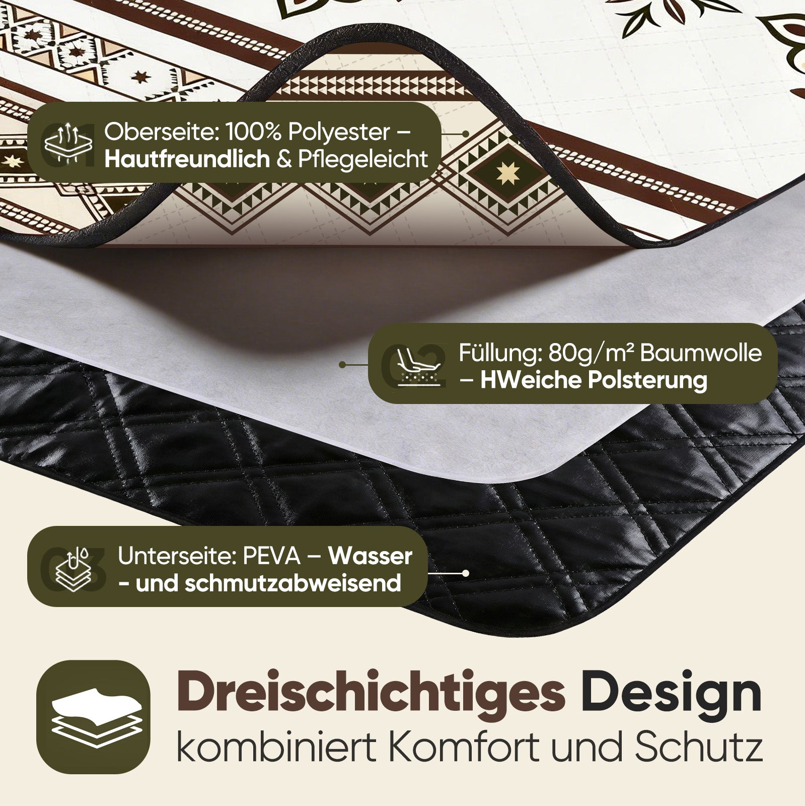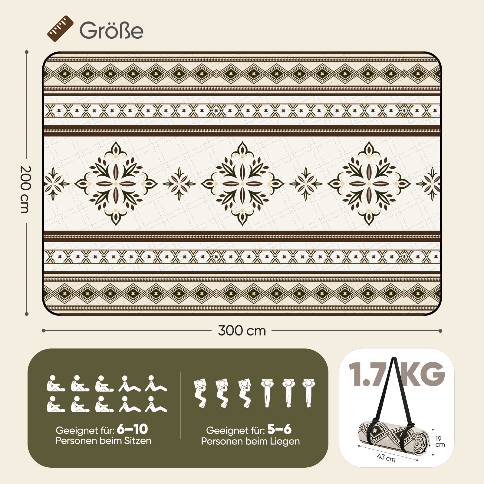 Die Sekey Picknickdecke 200x200 cm im Bohemian-Design vereint Retro-Elemente mit abgestimmten Beige-Tönen. Sie ist perfekt für alle, die Outdoor-Aktivitäten stilvoll genießen möchten – sei es Camping, Parkpicknick oder Strandbesuch. Die Decke bietet eine bequeme, saubere Sitzfläche und ist gleichzeitig ein Blickfang durch ihr einzigartiges Design.