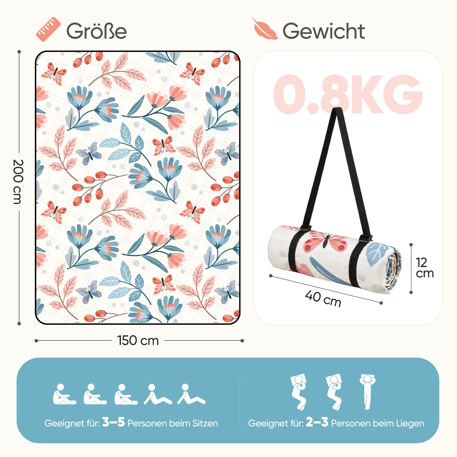Die Sekey Picknickdecke 200x200 cm bringt mit ihrem frischen Schmetterlings- & Blumenmuster sommerliche Leichtigkeit in jeden Outdoor-Ausflug. Die Kombination aus blauen Blättern und zarten rosa Blumen macht die Decke zum stilvollen Hingucker am Strand, im Park oder beim Camping.