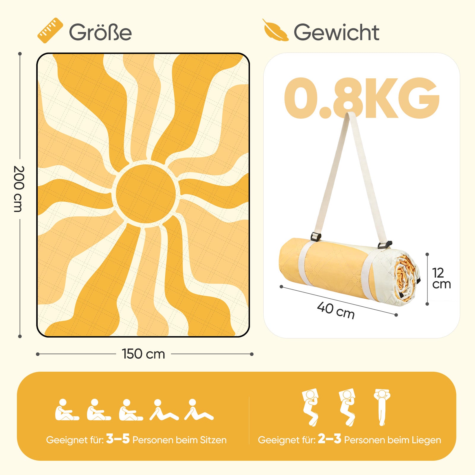Sekey Picknickdecke mit dreischichtiger Struktur: wasserfeste PEVA-Unterseite, gepolsterte Baumwollfüllung und sandfreie Oberfläche. Frisches Sonnen-Motiv, ideal für Picknick, Camping und Strand.