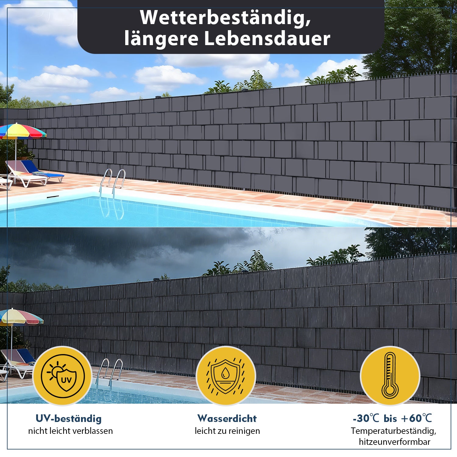 Eigenschaften: UV-beständig, wasserfest, reißfest, wind- und wetterbeständig