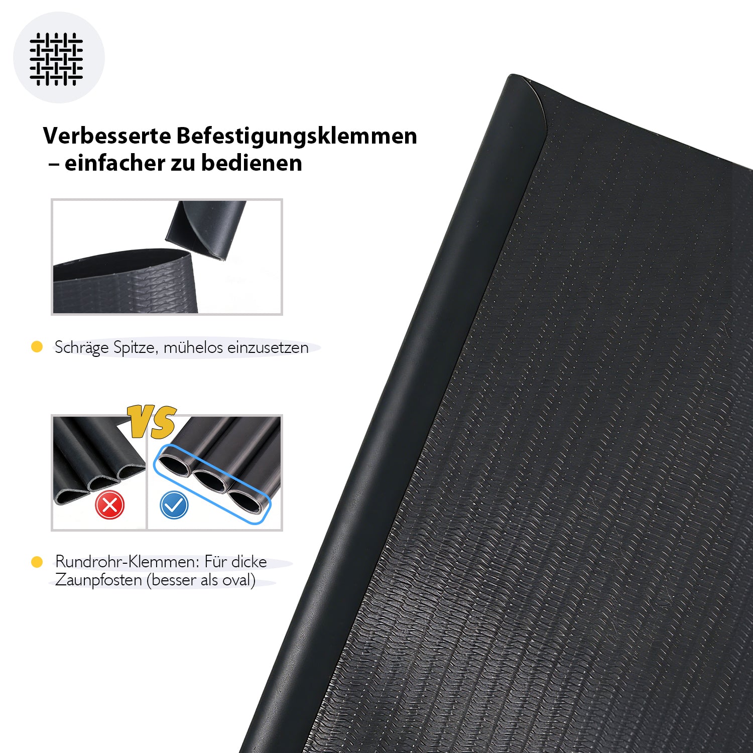 Für eine schnelle und sichere Installation sind verbesserte Befestigungsclips im Lieferumfang enthalten. Dank ihres ovalen Designs eignen sie sich besonders gut für stärkere Sichtschutzstreifen und bieten einen stabilen Halt. Die Clips sind bruchfest und lassen sich dank der leicht spitzen Enden mühelos in das Doppelstabgeflecht einsetzen, wodurch die Montage schnell und unkompliziert gelingt.