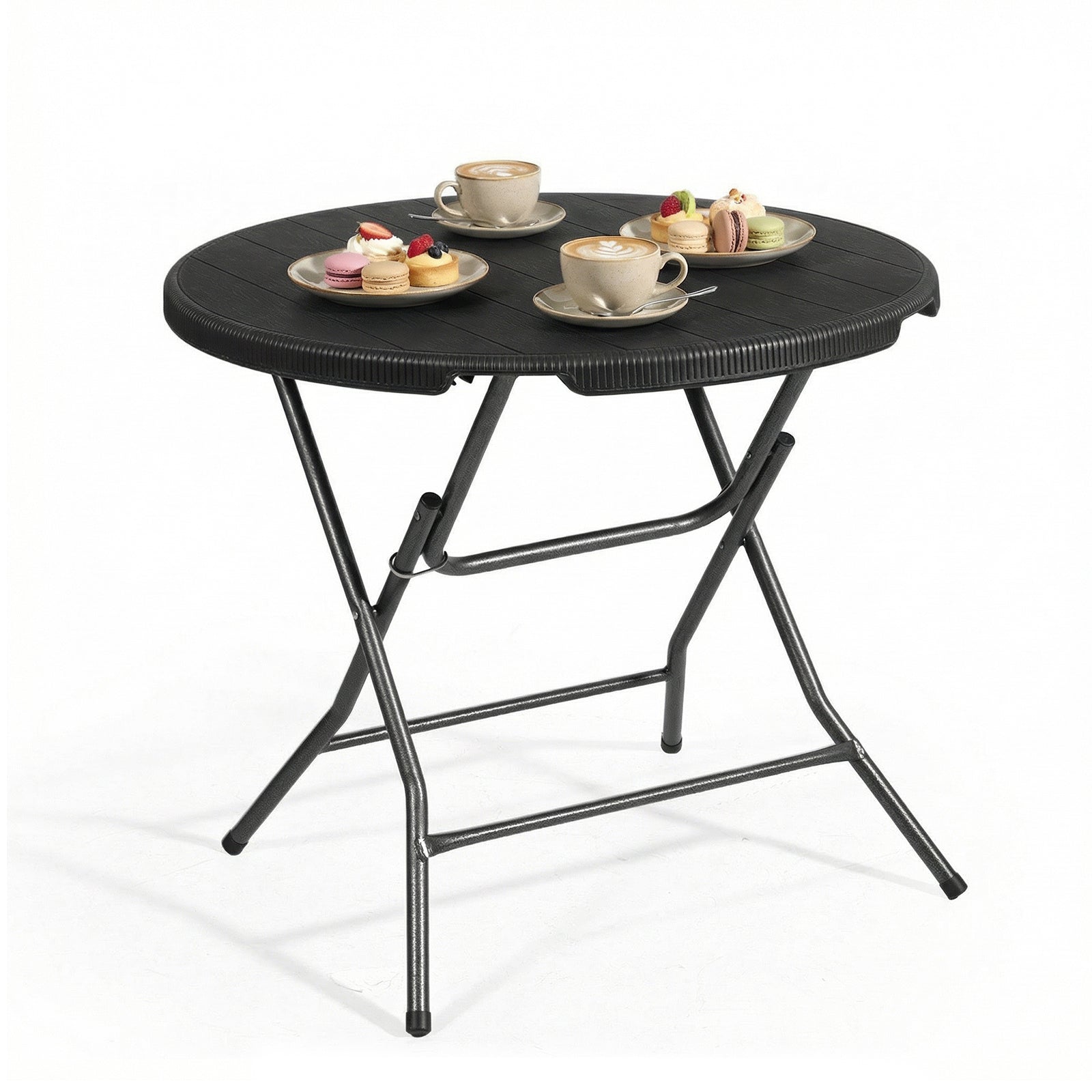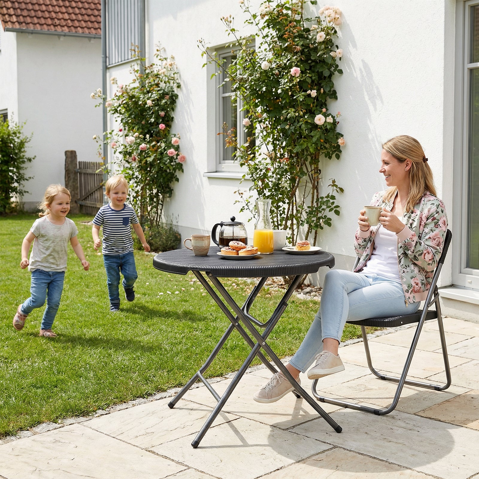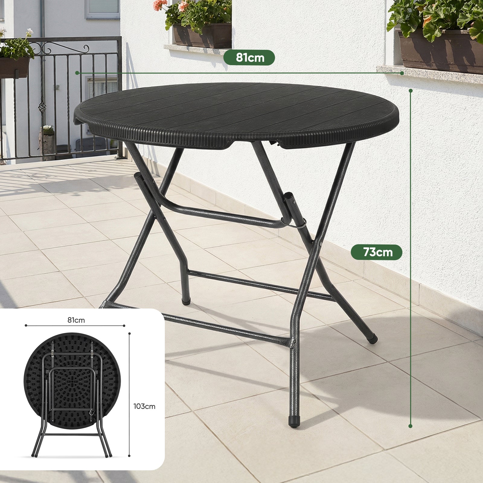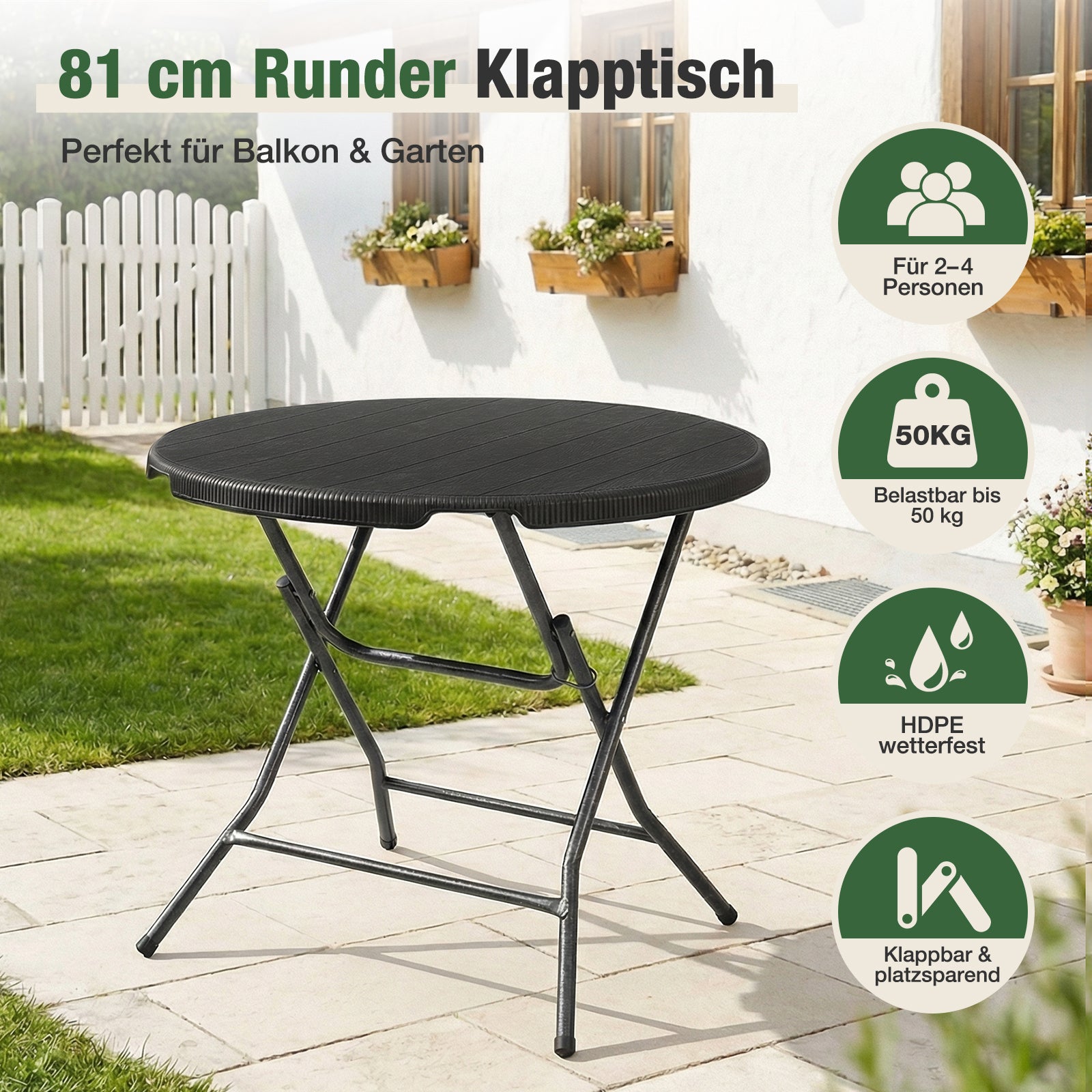 Dank des praktischen Klappdesigns ist der Tisch in wenigen Sekunden einsatzbereit – ohne Montage. Nach Gebrauch lässt er sich flach zusammenklappen und platzsparend verstauen, ideal für kleinere Balkone oder als zusätzlicher Tisch für spontane Anlässe.