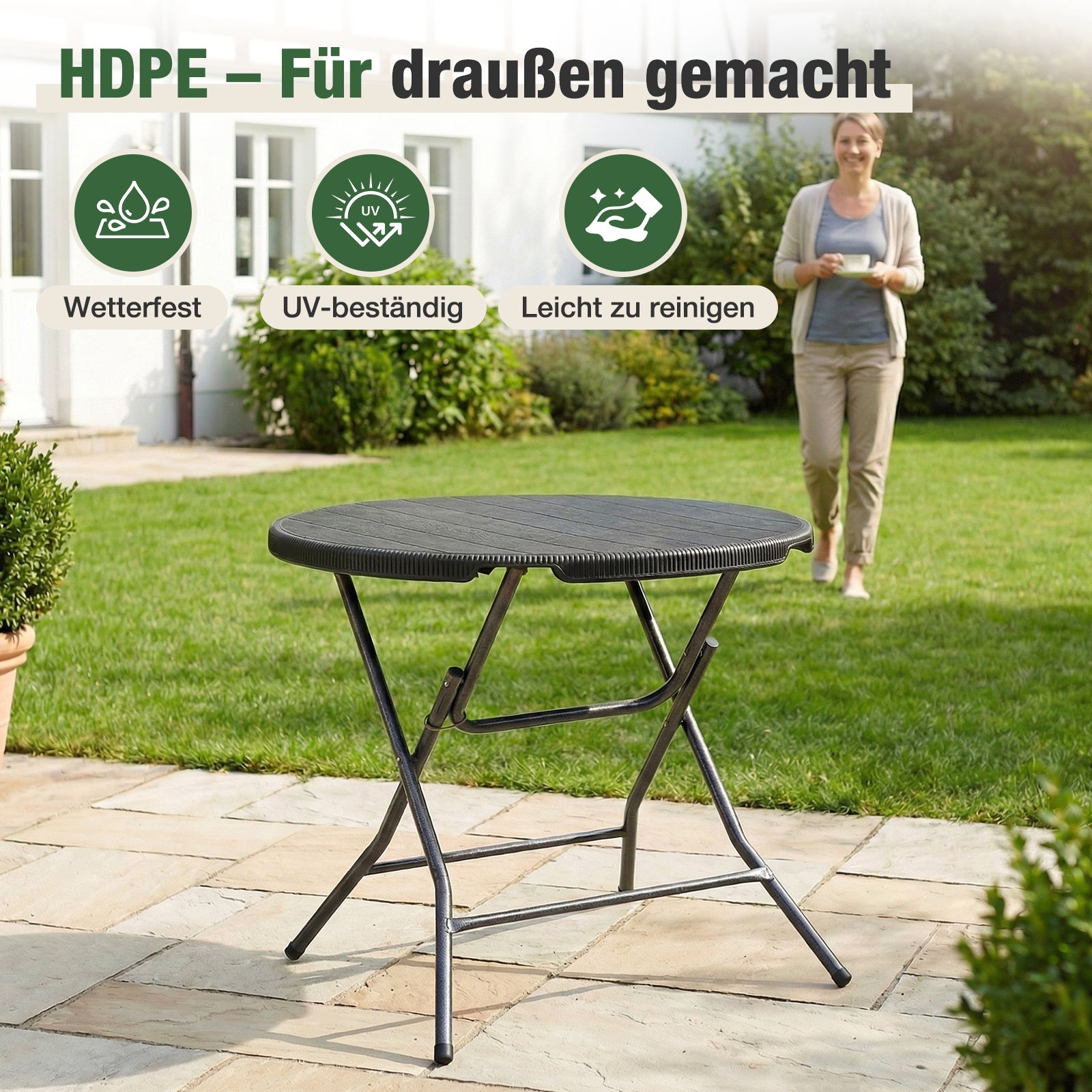 Die Tischplatte aus robustem HDPE-Kunststoff in Holzoptik verbindet eine natürliche Optik mit hoher Widerstandsfähigkeit. Sie ist wetterfest, pflegeleicht und lässt sich einfach reinigen – ideal für den täglichen Einsatz im Außenbereich.
