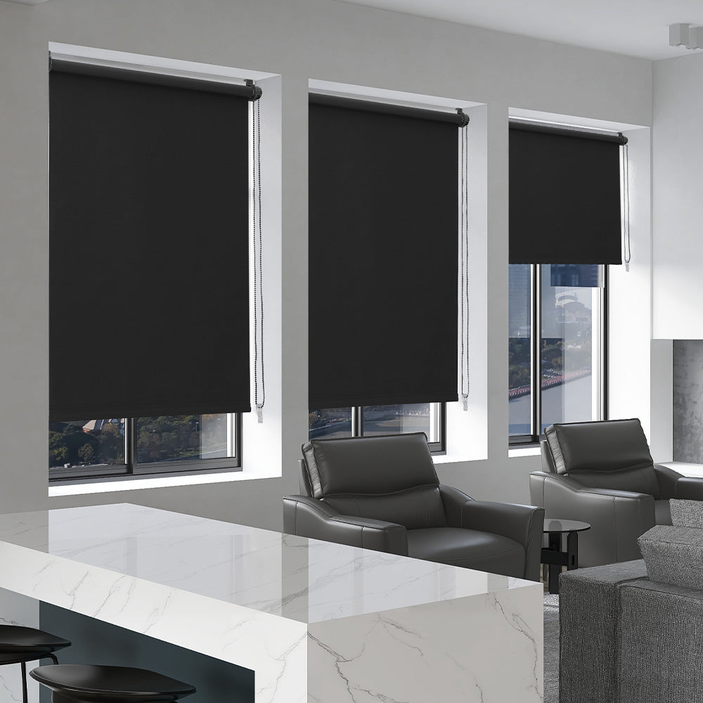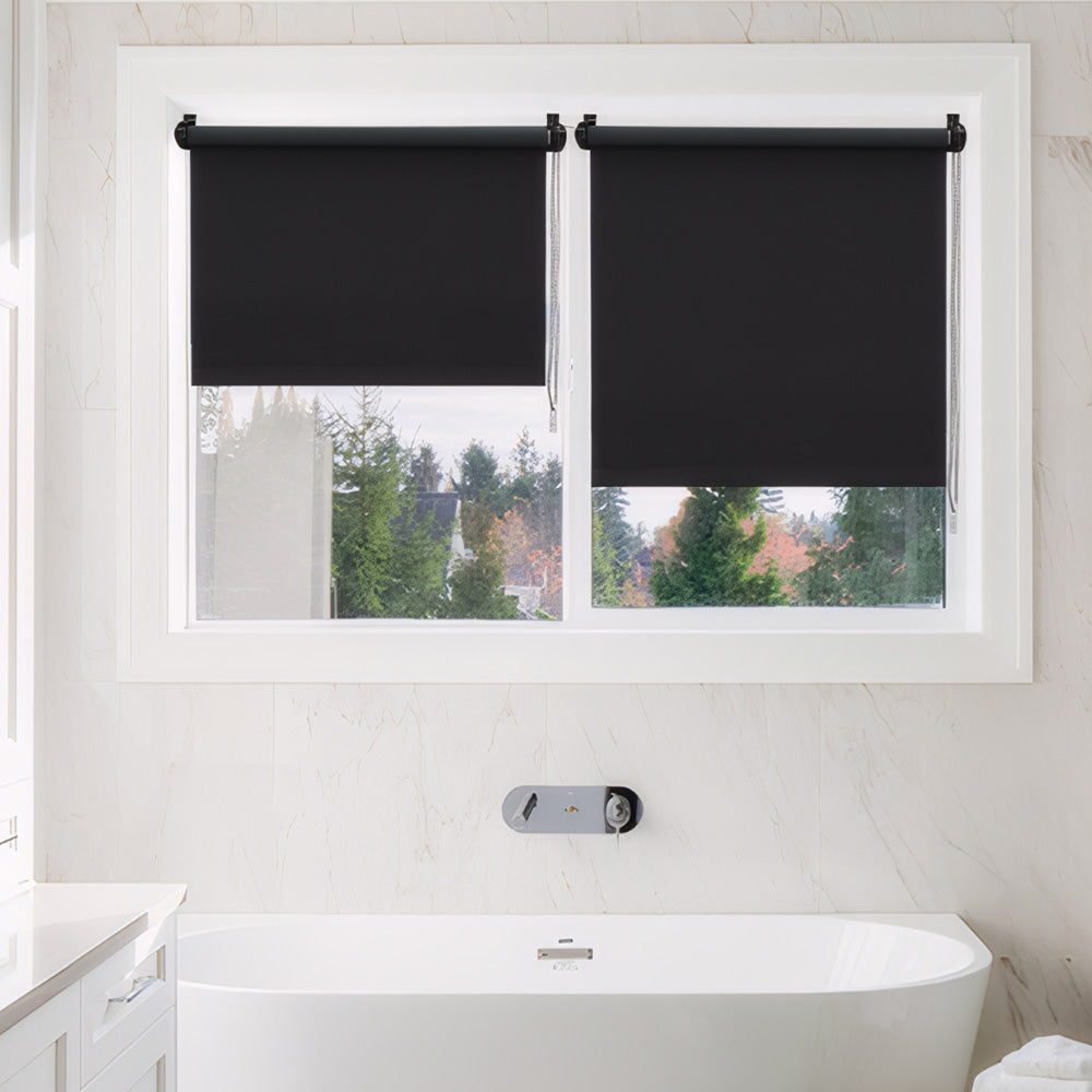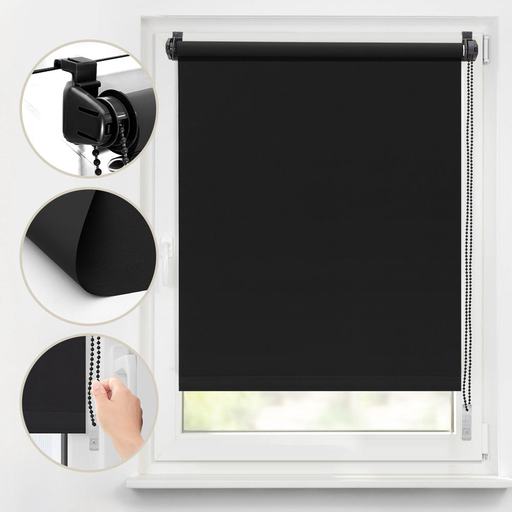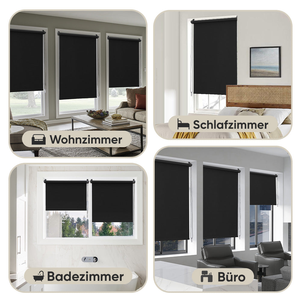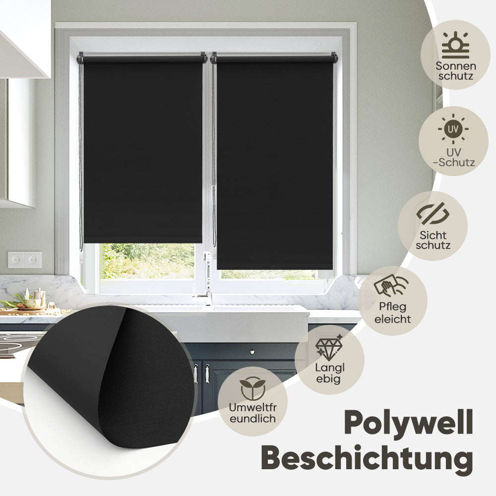 Über den Seitenzug kann das Rollo stufenlos in der Höhe verstellt werden, sodass Licht und Sichtschutz individuell angepasst werden können. Die elegante schwarze Farbe unterstreicht ein modernes Wohnambiente und passt zu unterschiedlichen Einrichtungsstilen.