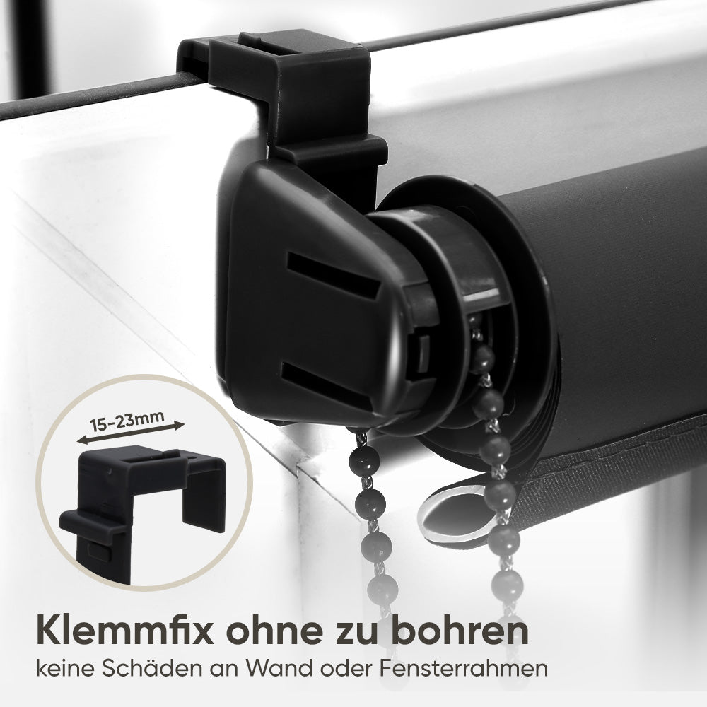 Dank des praktischen Klemmfix-Systems lässt sich das Rollo ganz ohne Bohren am Fensterrahmen befestigen und hinterlässt keine Spuren. Alternativ ist auch eine Montage mit Schrauben möglich. Die energiesparende Beschichtung schützt vor UV-Strahlen, reduziert Hitze im Sommer und hilft, Wärme im Winter im Raum zu halten.