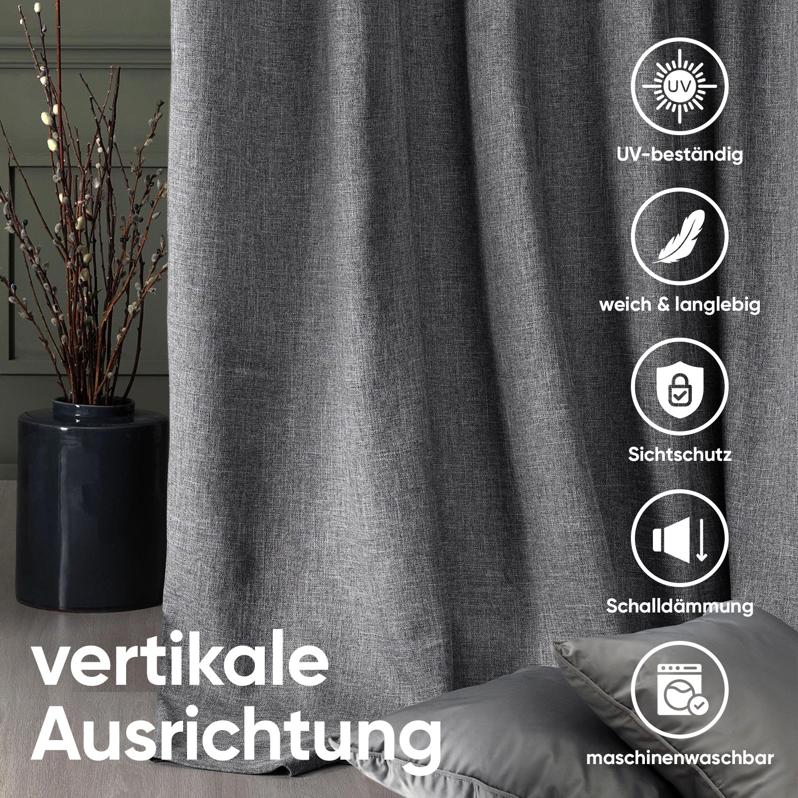 Ausgestattet mit stabilen Metallösen (Ø 4 cm) lässt sich der Vorhang schnell und mühelos an jeder gängigen Gardinenstange aufhängen. Das hochwertige Polyestergewebe mit wasserabweisender Rückseite ist leicht, formstabil und pflegeleicht. Dank des zeitlosen Uni-Designs fügt sich der Vorhang harmonisch in moderne wie klassische Einrichtungsstile ein.