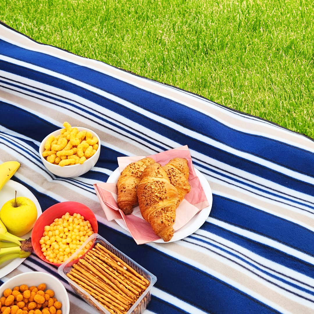 Das elegante Streifendesign in harmonischen Blau-Weiß-Beige-Tönen passt stilvoll zu jeder Outdoor-Kulisse – ob Picknick, Campingabend oder Spielmatte.
