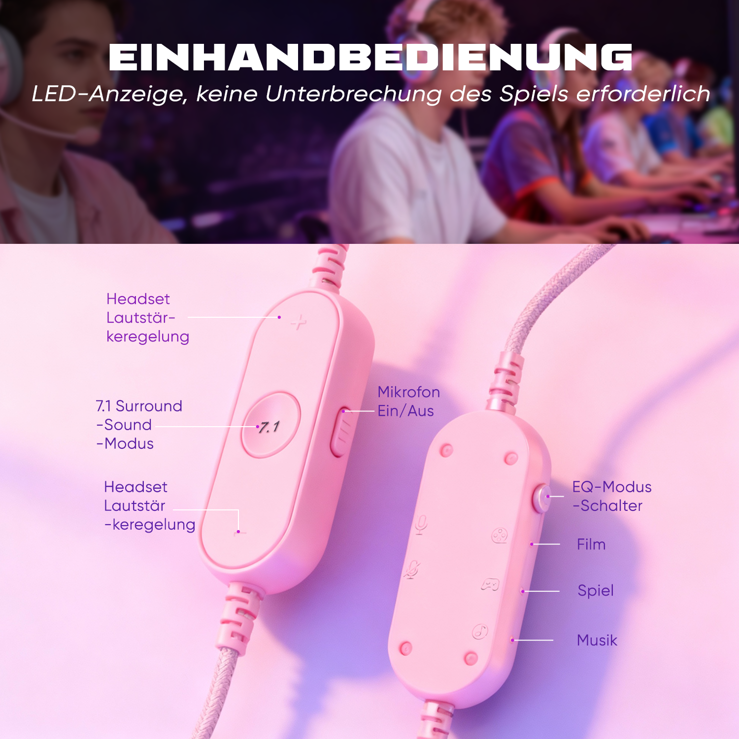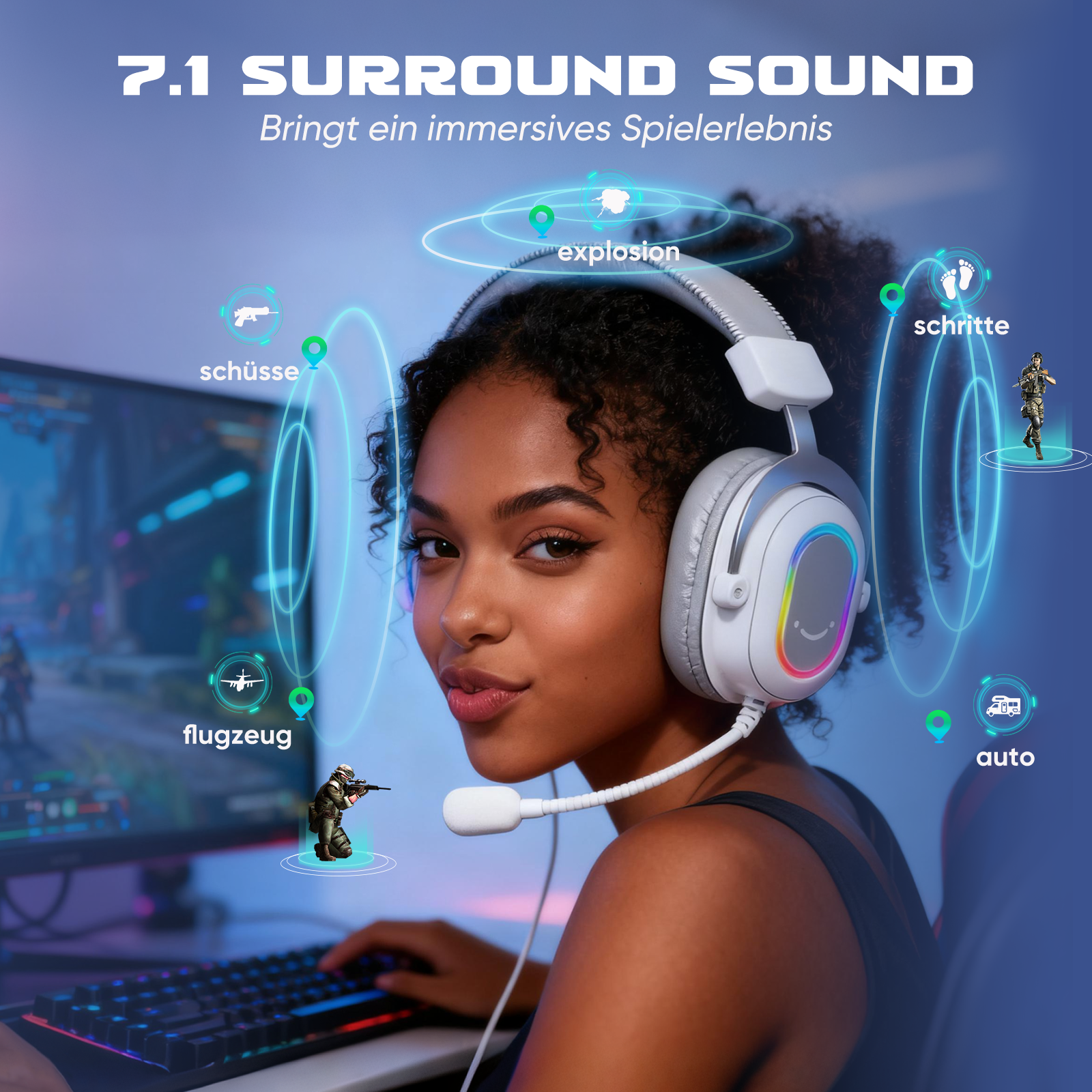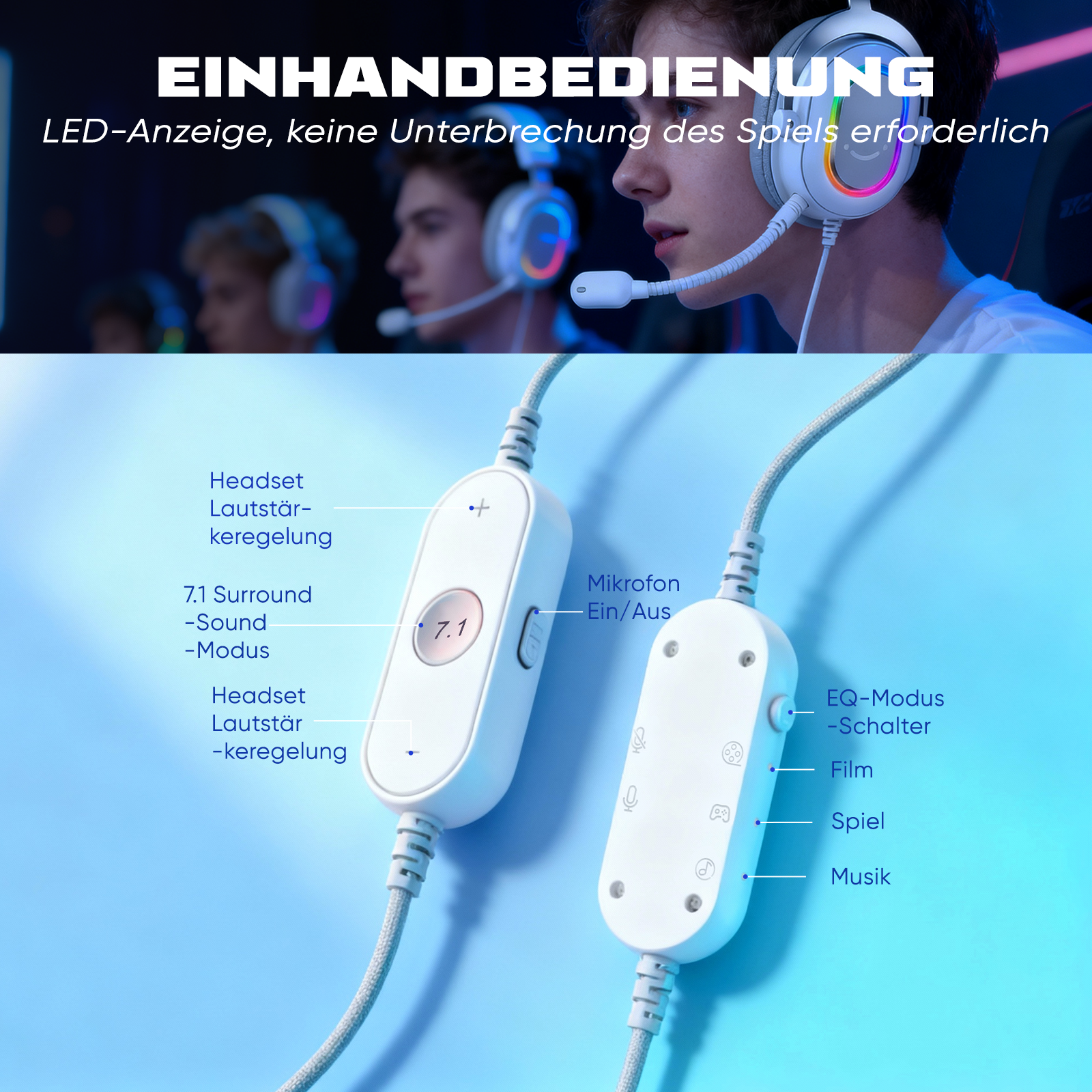 Cooles RGB-Design: Mit dem farbenfrohen RGB schafft das Gaming Headset eine stilvolle Beleuchtung auf Ihrem Desktop und ist eine coole Ergänzung beim Gaming und Livestreaming.