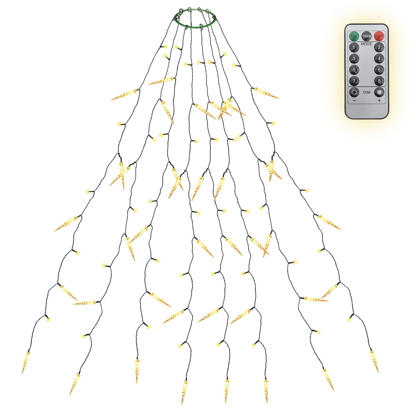 Einfache Installation: Ring an der Baumspitze befestigen, 8 Stränge herabhängen lassen – fertig dekoriert in Minuten!