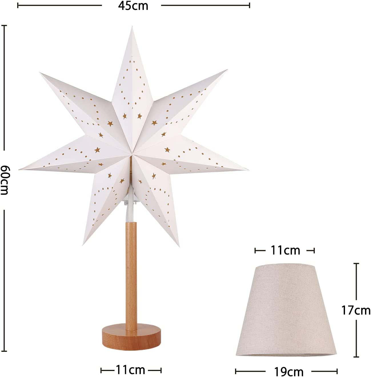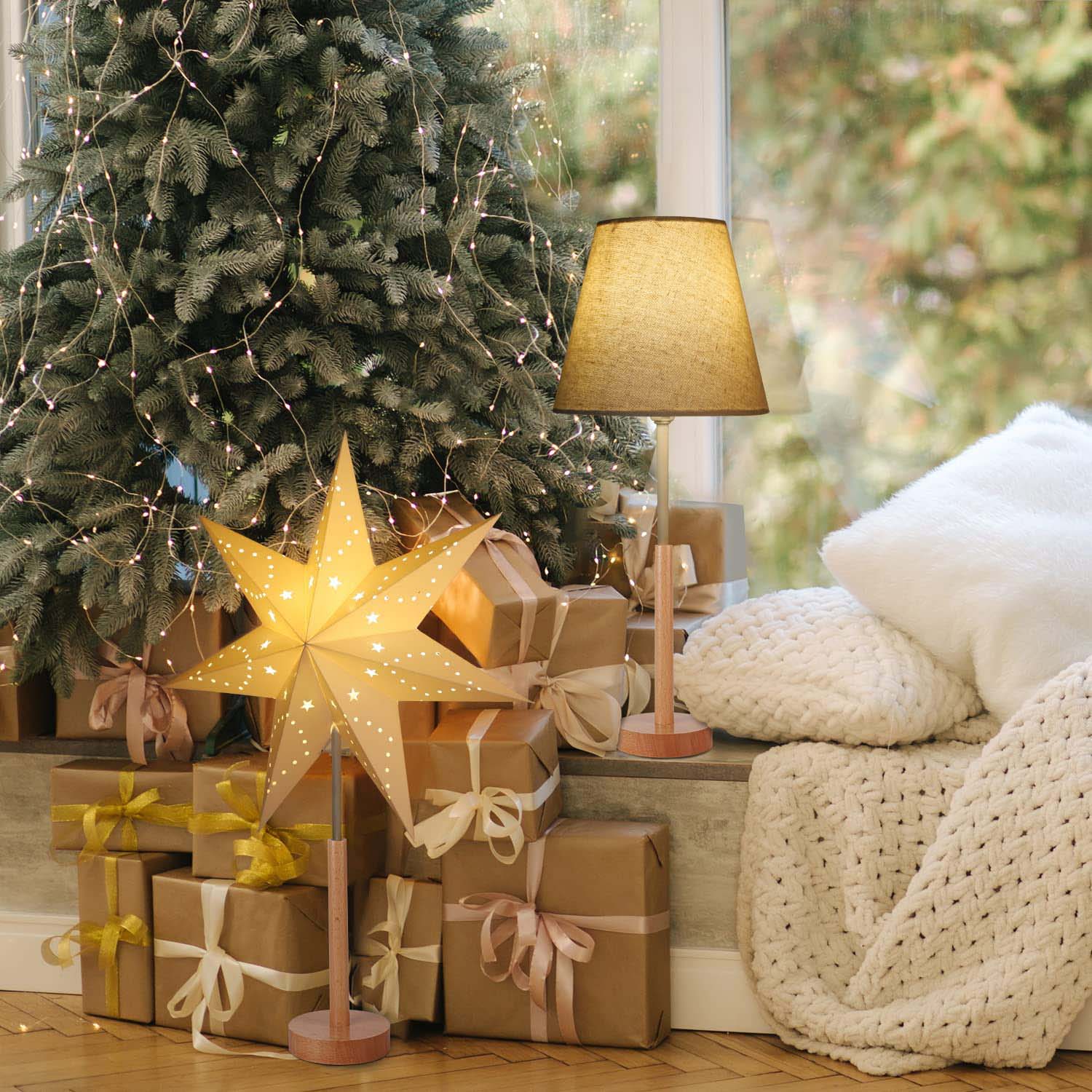 Der siebenzackige LED Papierstern auf einem eleganten Holzsockel verleiht jedem Raum eine warme, gemütliche Atmosphäre. Dank der zwei mitgelieferten Lampenschirme lässt sich der Stern nicht nur als stimmungsvolle Weihnachtsdeko, sondern auch als stilvolle Tischlampe im Vintage-Look verwenden.