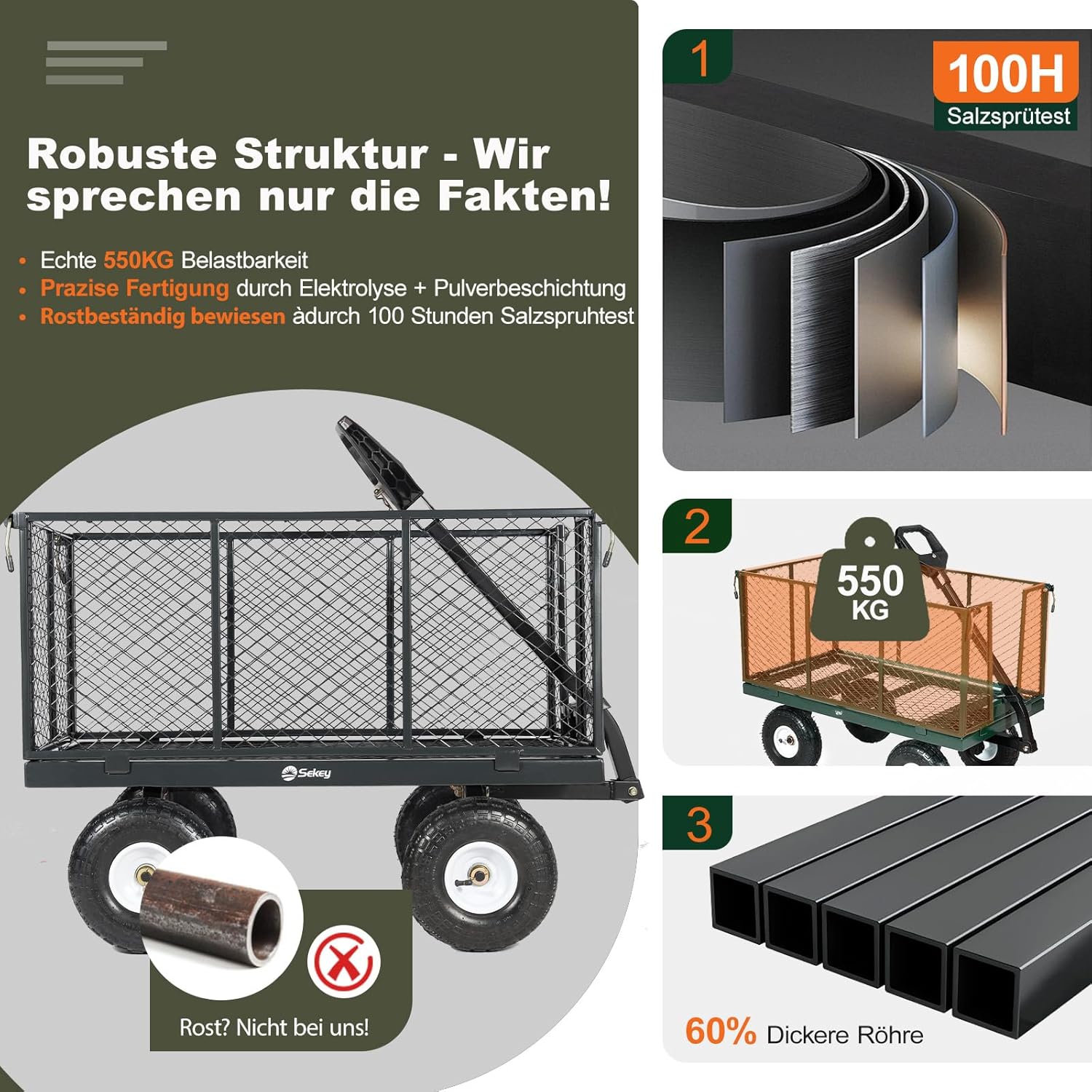Alle Metallteile sind elektrophoretisch behandelt und pulverbeschichtet. Der Gartenwagen bleibt selbst nach einem 72-Stunden-Salznebeltest rostfrei und widerstandsfähig – ideal für alle Wetterbedingungen.