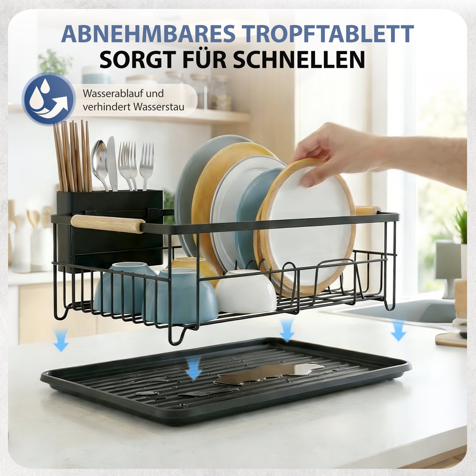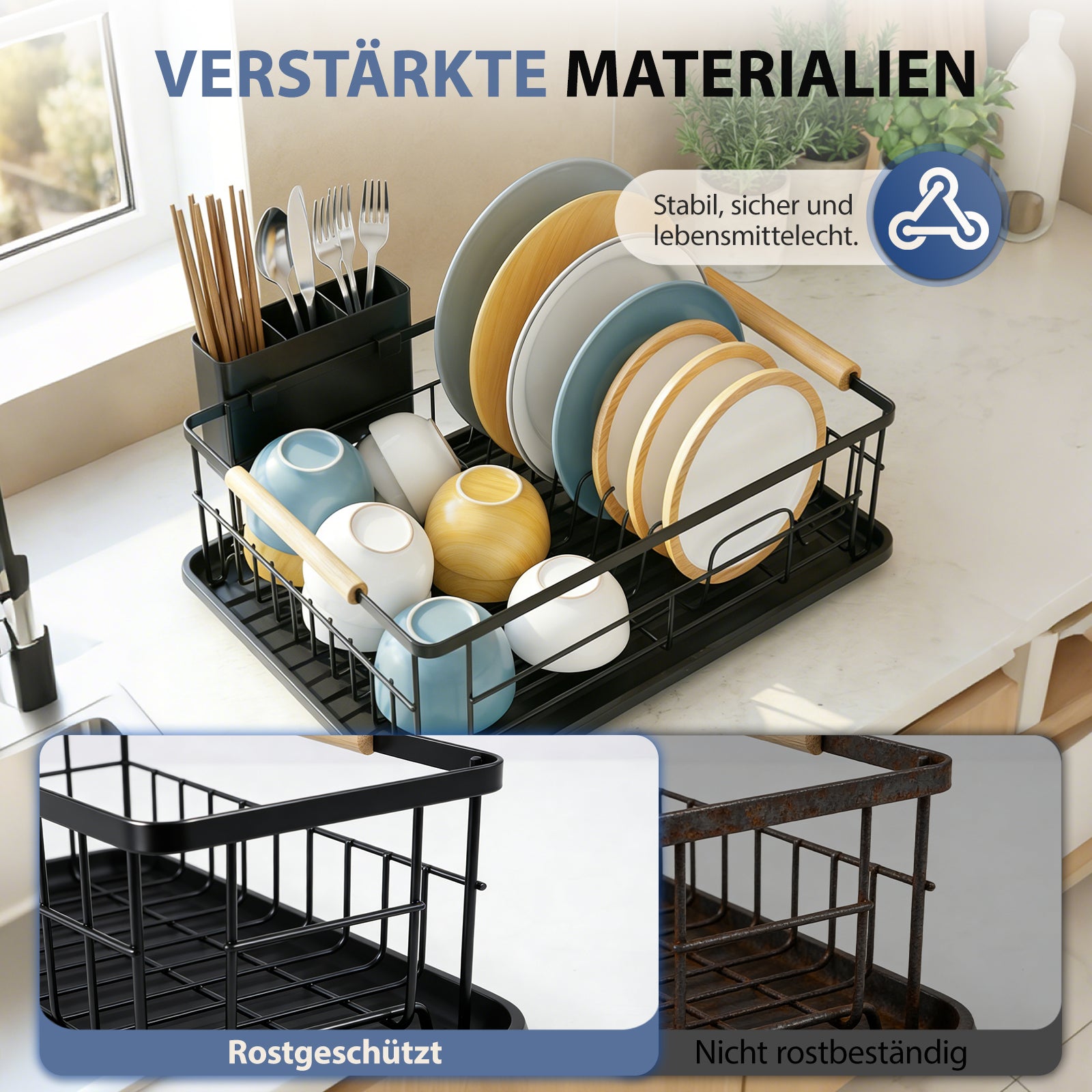 Die verstärkte Konstruktion sorgt für sicheren Stand, auch bei voller Beladung. Das stabile Design verhindert Kippen oder Wackeln und garantiert, dass Ihr Geschirr sicher aufbewahrt wird.