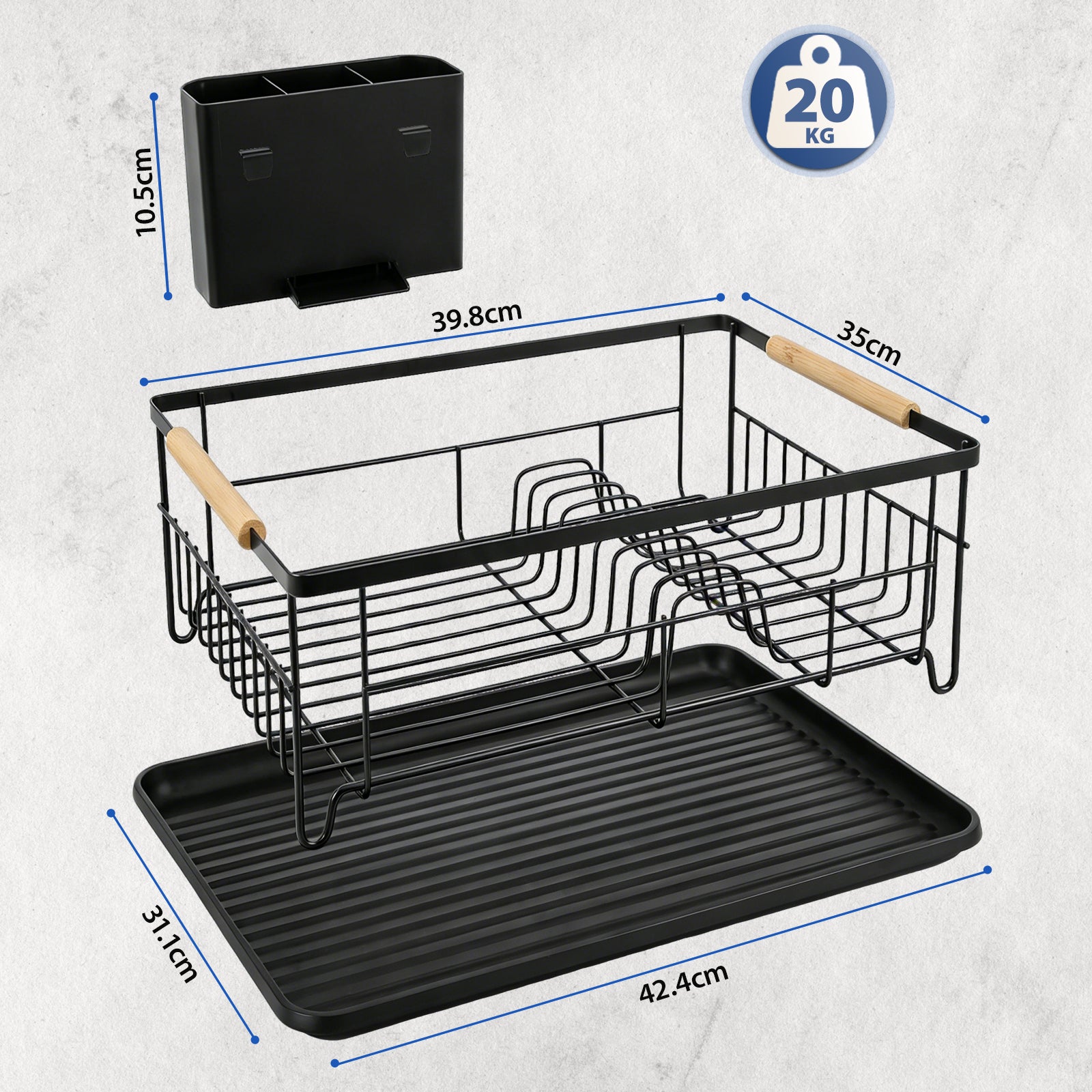 Mit kompakten Abmessungen von 42,4 x 31 x 16,6 cm passt dieses Abtropfgestell perfekt in die meisten Spülbecken oder auf enge Arbeitsplatten. Es bietet Platz für bis zu 10 Teller sowie weitere Schüsseln und Gläser, hält Ihre Küche ordentlich und spart wertvollen Stauraum.