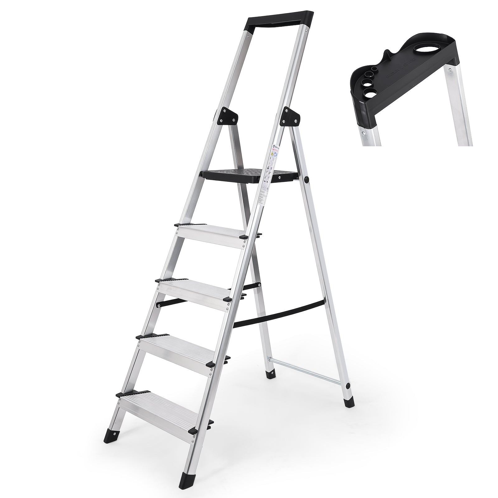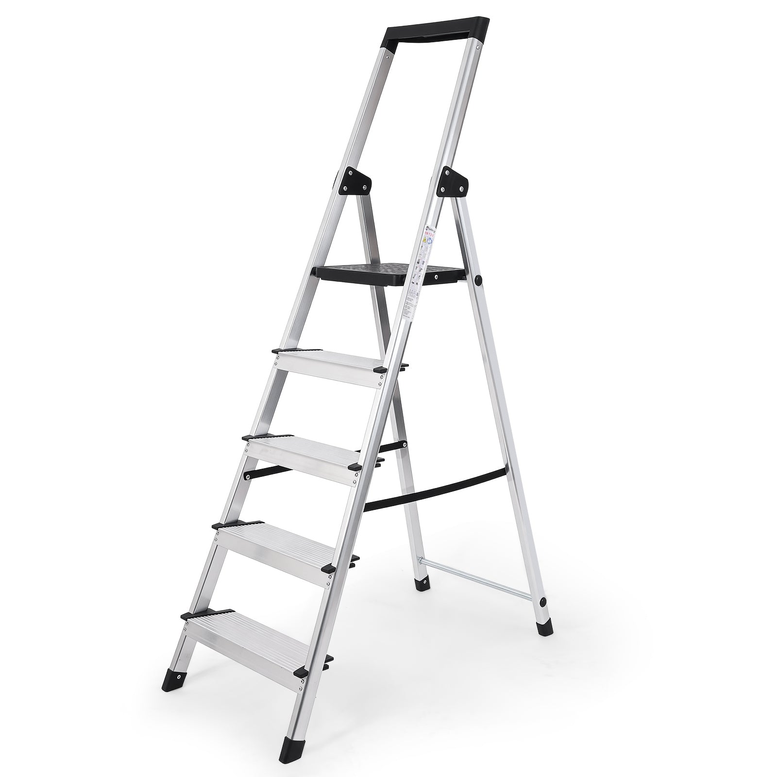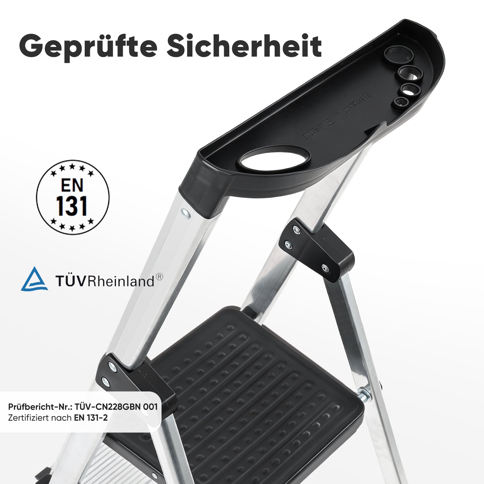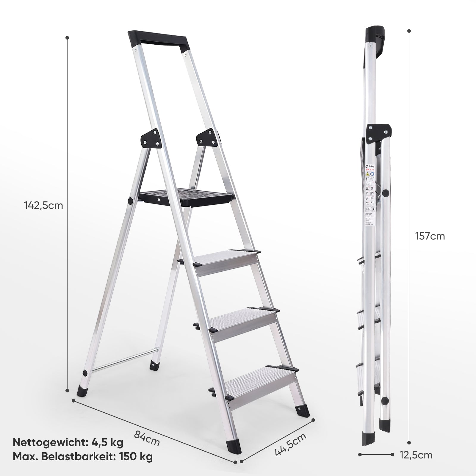 Die Sekey Aluminium Trittleiter mit 4 oder 5 Stufen (140/160 cm) ist die perfekte Lösung für Haushalt, Garage oder Garten. TÜV-geprüft nach EN 131-2 bietet sie geprüfte Stabilität und eine maximale Belastbarkeit von 150 kg.