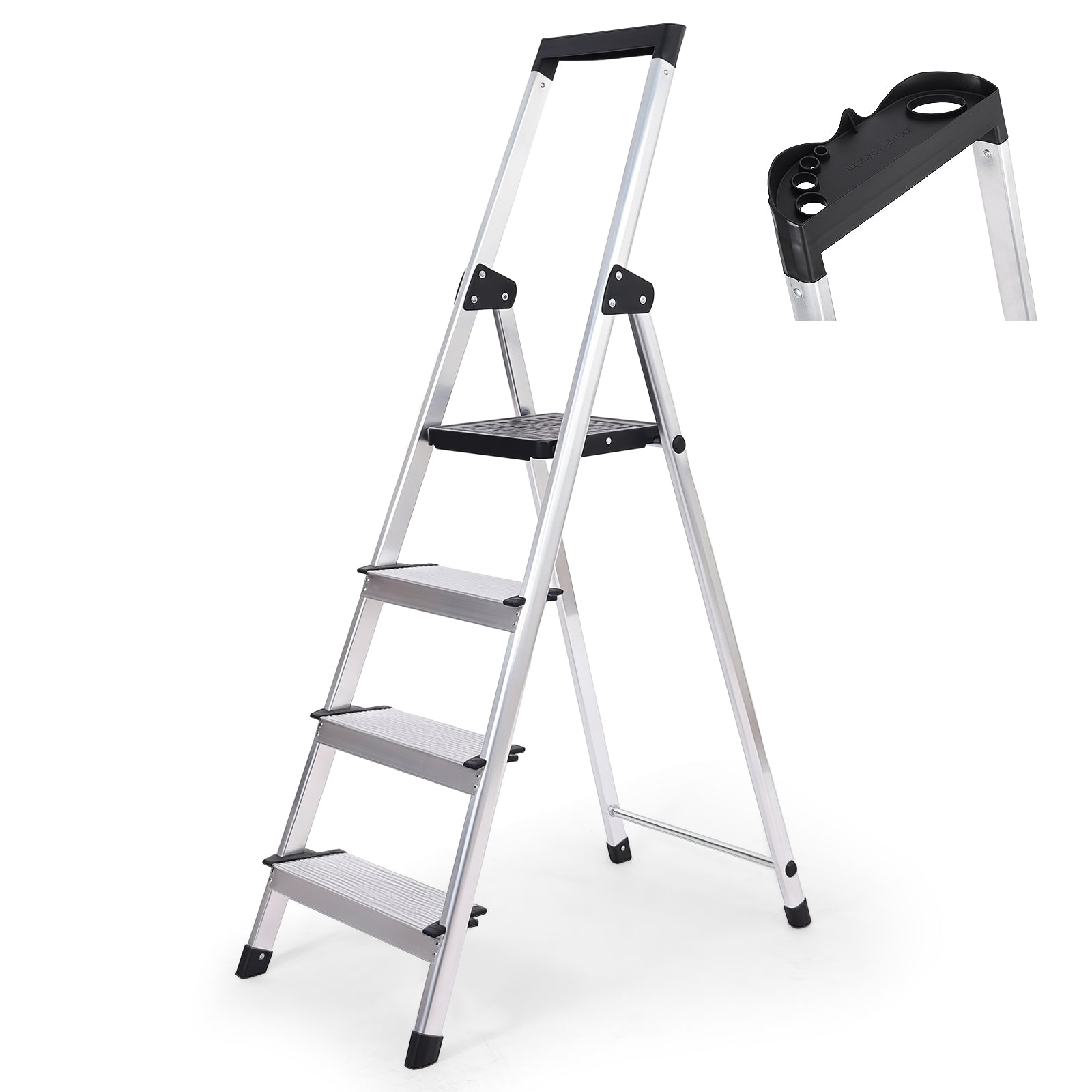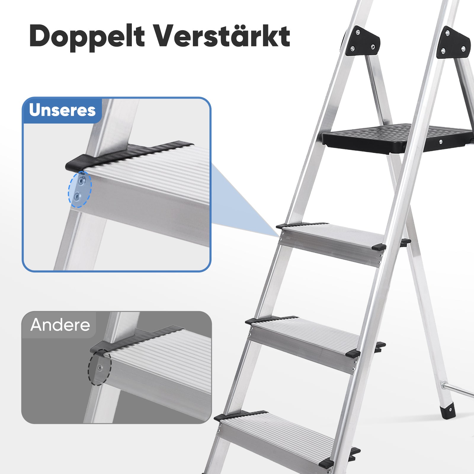 Erhältlich in 4 Stufen (140 cm) oder 5 Stufen (160 cm) – robust, leicht und zuverlässig.