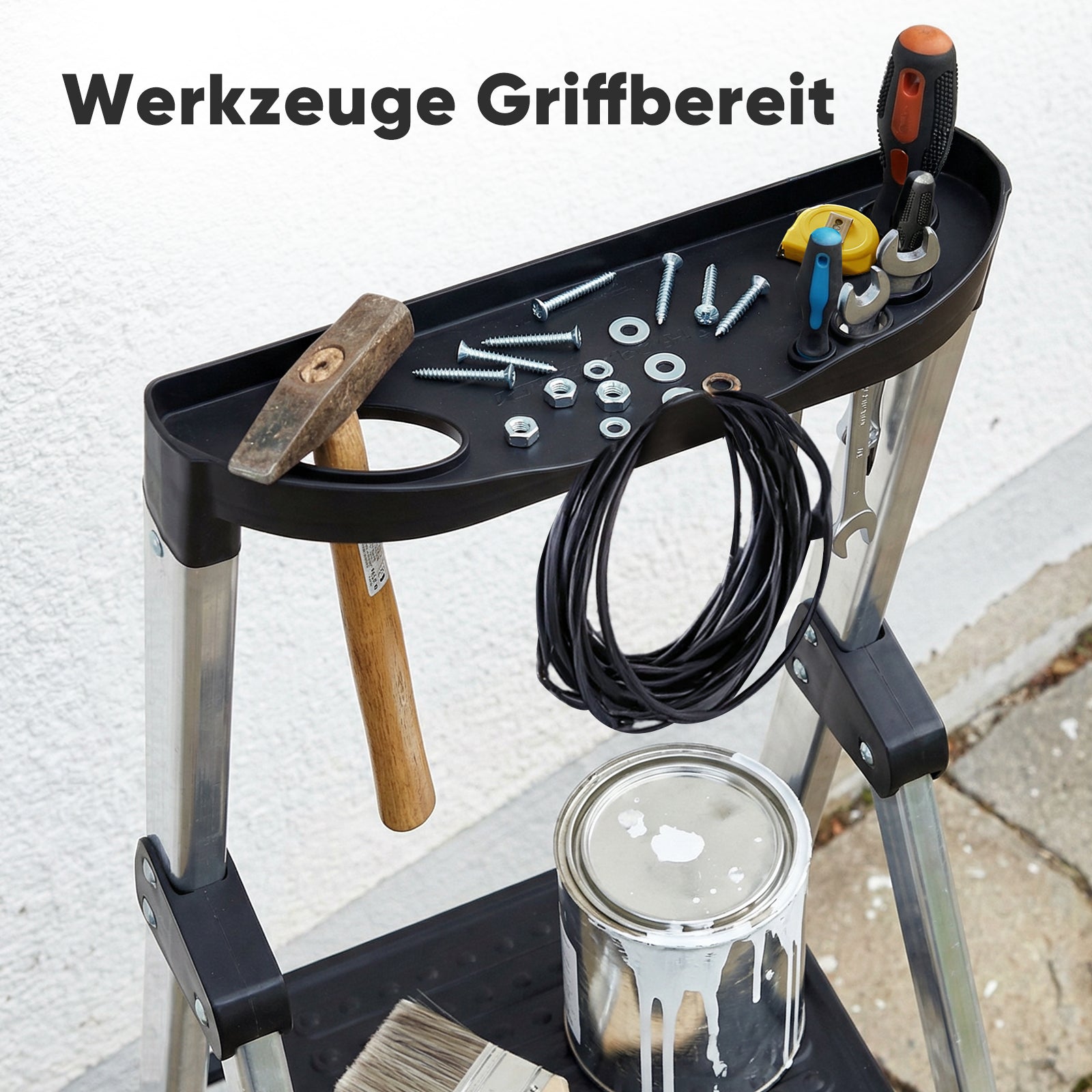 Die integrierte Ablageschale oben hält Schrauben, Werkzeuge und Maßband griffbereit – kein ständiges Auf- und Absteigen nötig.