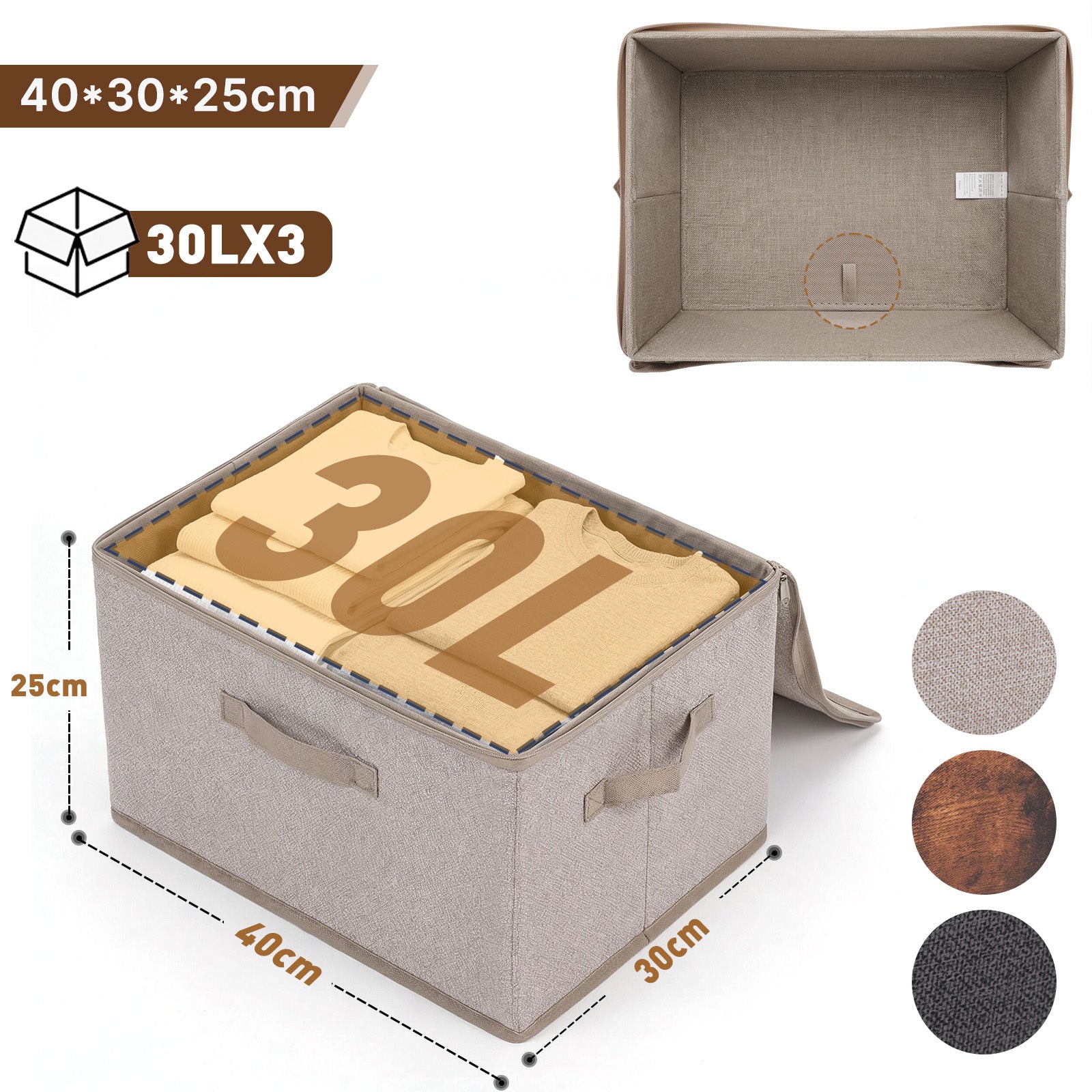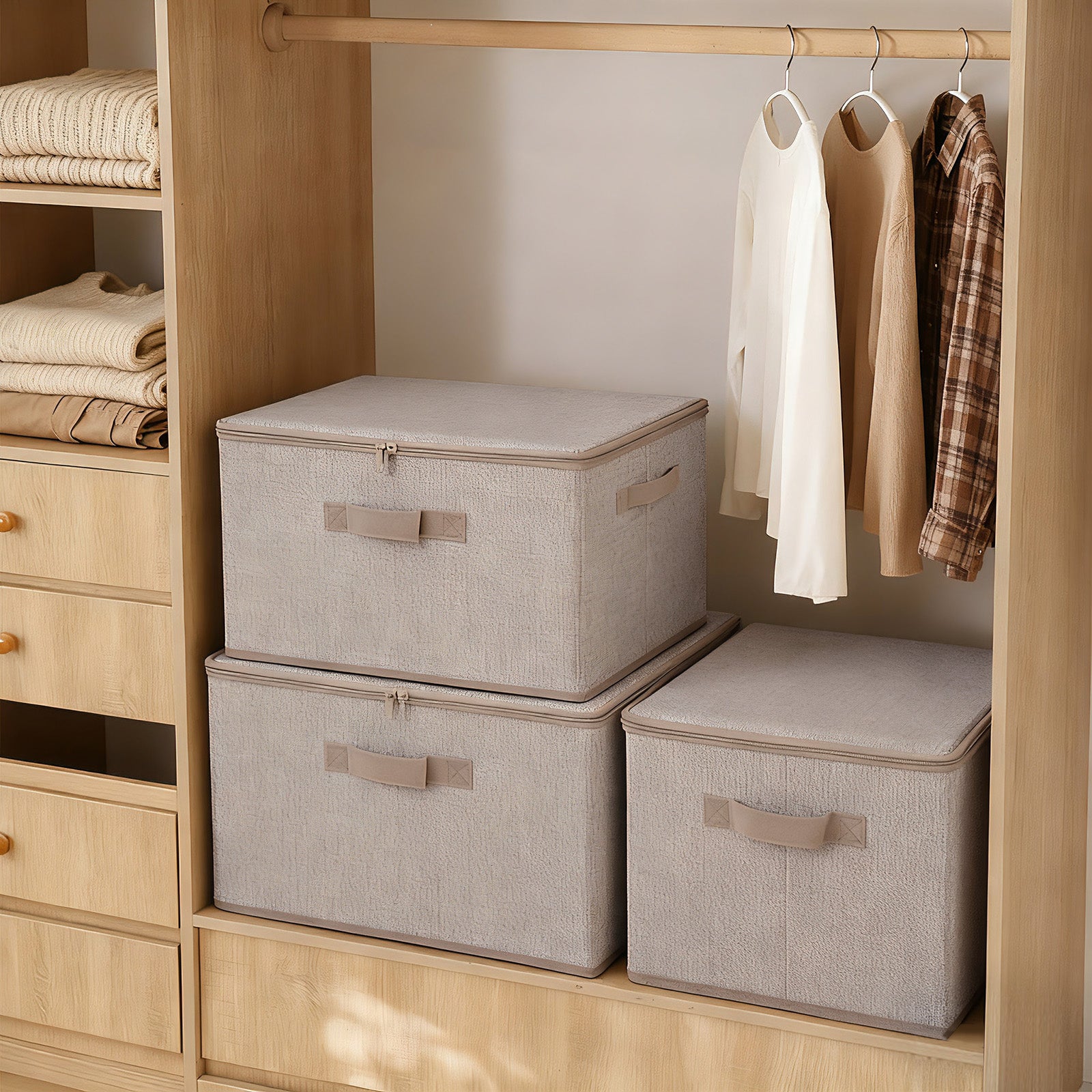 Dieses Aufbewahrungsboxen Set (3er) bietet eine praktische und stilvolle Lösung für mehr Ordnung im Alltag. Mit einem handlichen Format von ca. 40 × 30 × 25 cm eignen sich die Stoffboxen ideal für Kleiderschränke, Regale oder offene Aufbewahrungssysteme und schützen Kleidung, Bettwäsche oder Accessoires zuverlässig vor Staub.