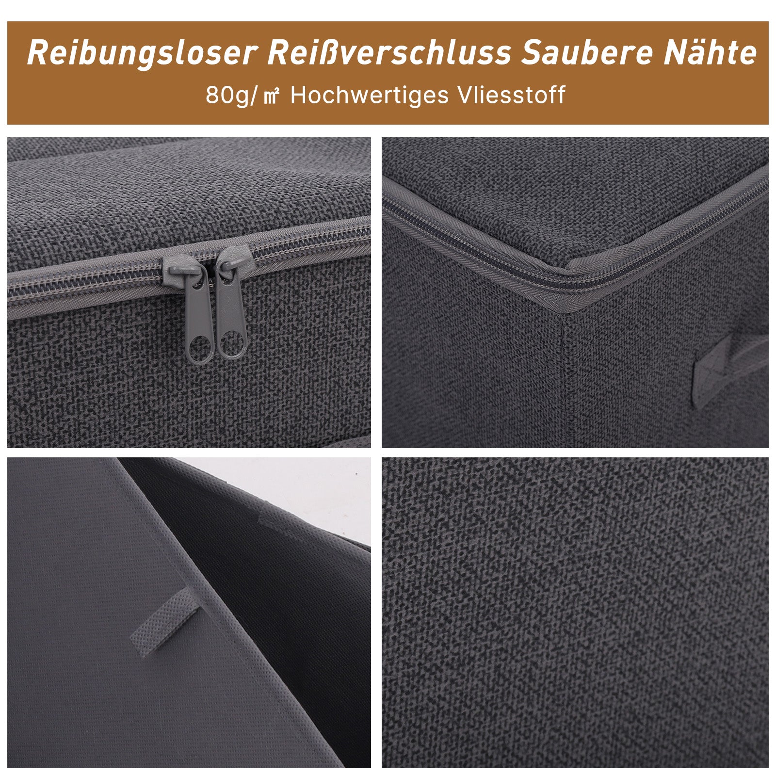 Gefertigt aus 80 g/m² Vliesstoff mit stabilem Kartoneinsatz, sind die Boxen formstabil, belastbar und für den täglichen Gebrauch konzipiert. Der Deckel mit Doppelreißverschluss ermöglicht schnellen Zugriff, während drei integrierte Tragegriffe das Herausziehen und Transportieren besonders komfortabel machen.