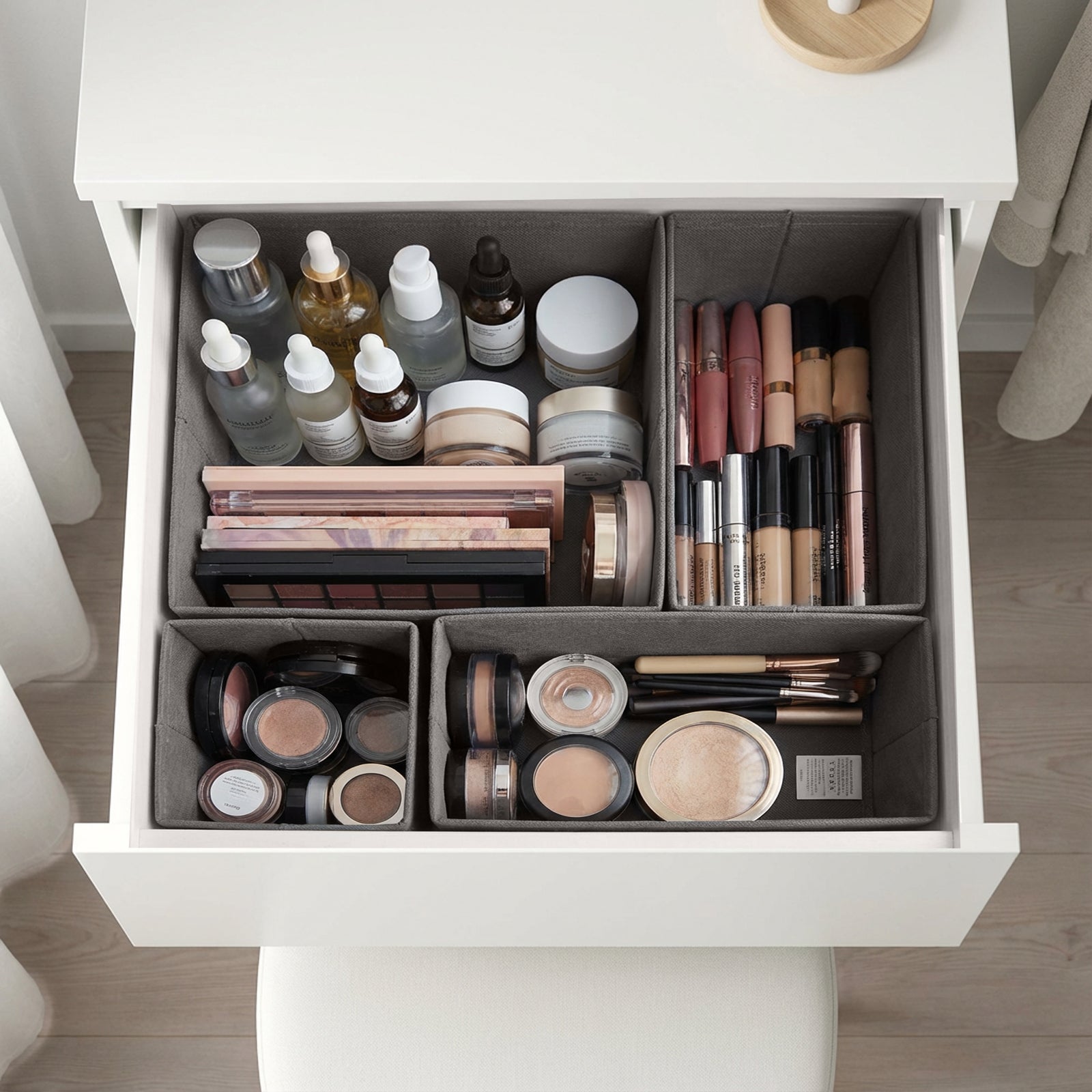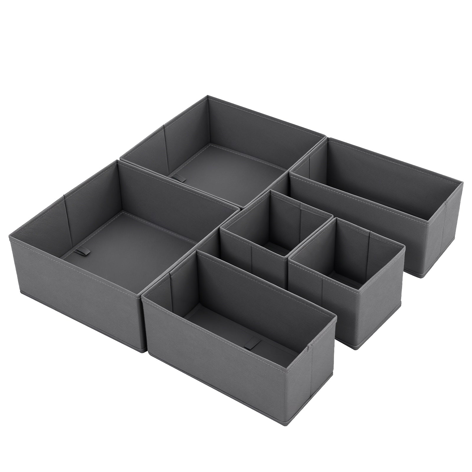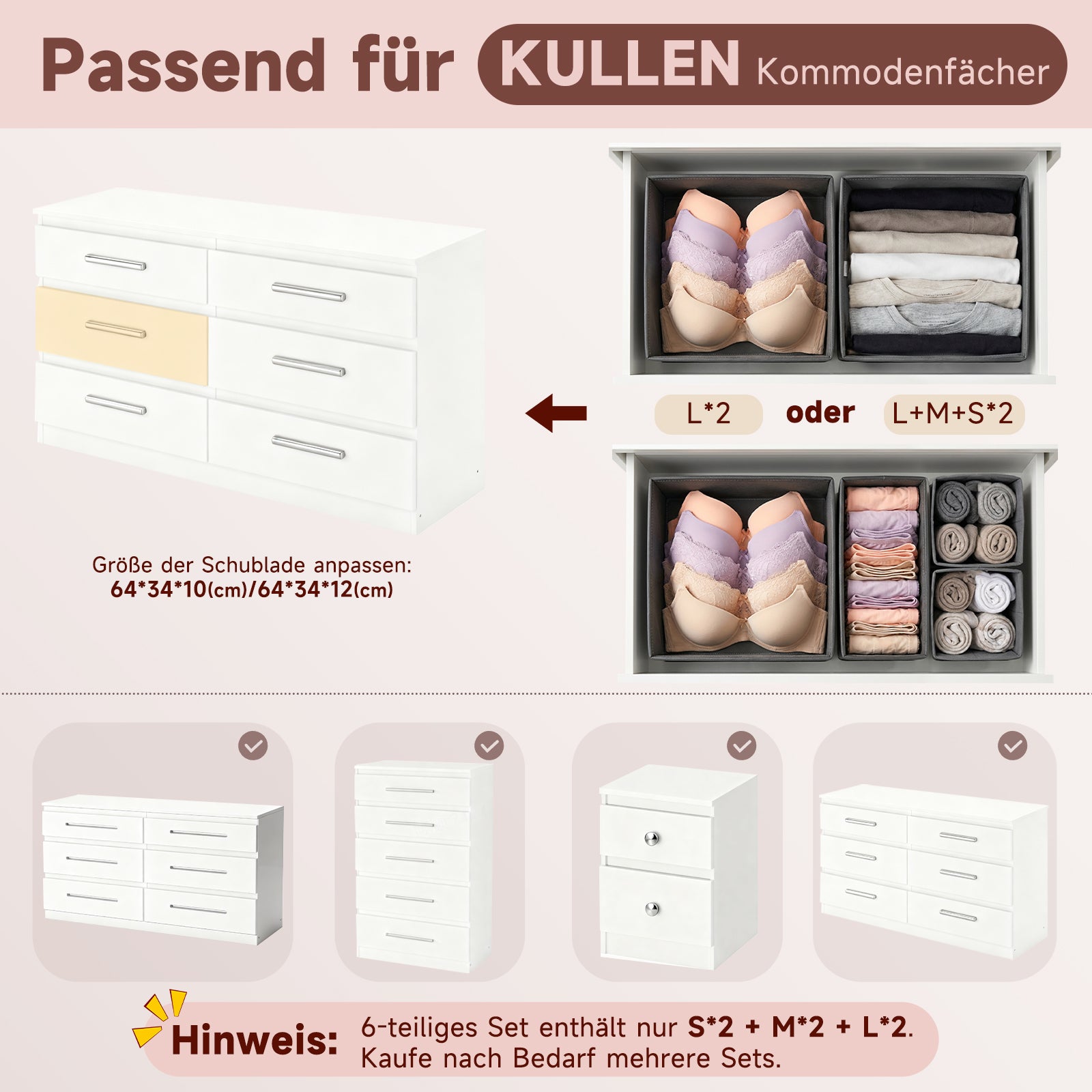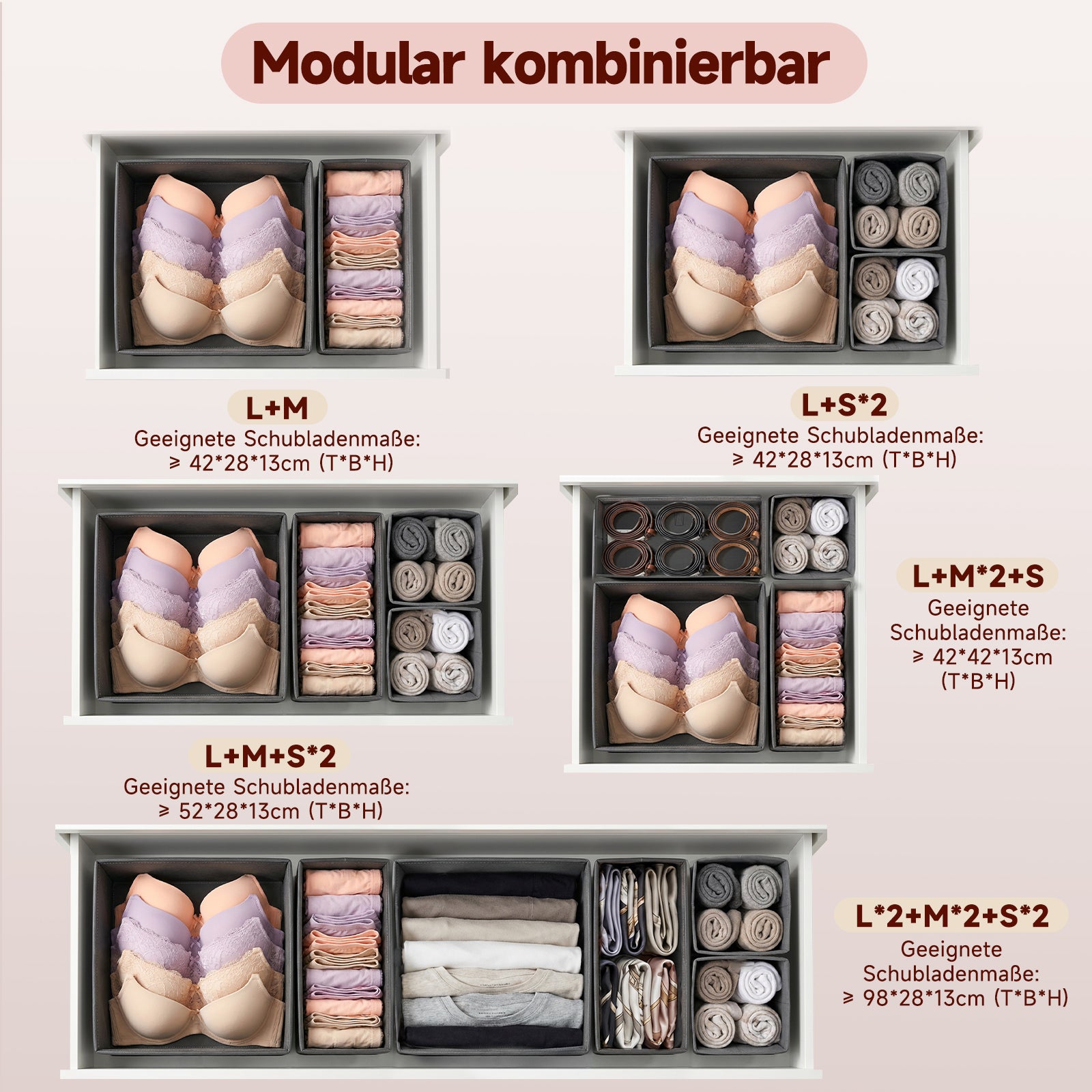 Das Aufbewahrungsboxen Set S bietet eine durchdachte Lösung für übersichtliche Ordnung in Schubladen und Regalen. Das 6er Set besteht aus drei unterschiedlichen Größen (28 × 28 × 13 cm, 14 × 28 × 13 cm und 14 × 14 × 13 cm, je 2 Stück) und eignet sich ideal zum Sortieren von Kleidung, Unterwäsche, Accessoires, Spielzeug oder Dokumenten.