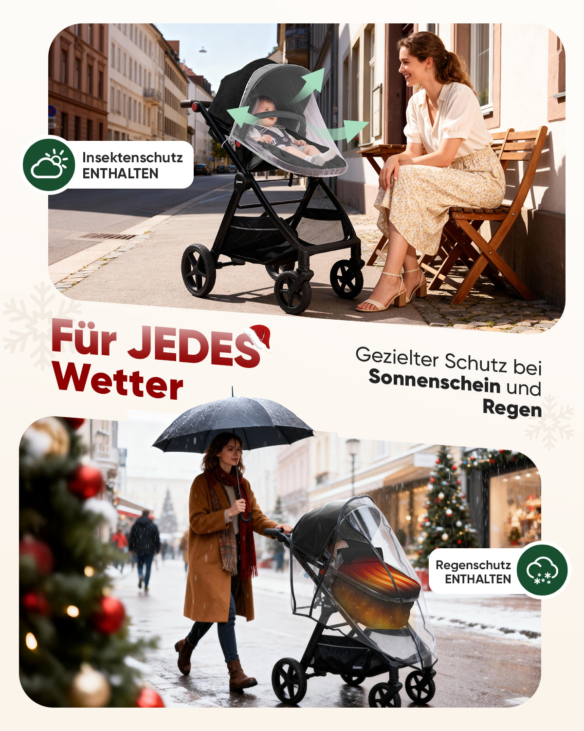 Dank integriertem Moskitonetz, Regenschutz und großem Sonnendach ist Ihr Kind bei jeder Witterung geschützt – perfekt für alle Jahreszeiten und Wetterlagen.
