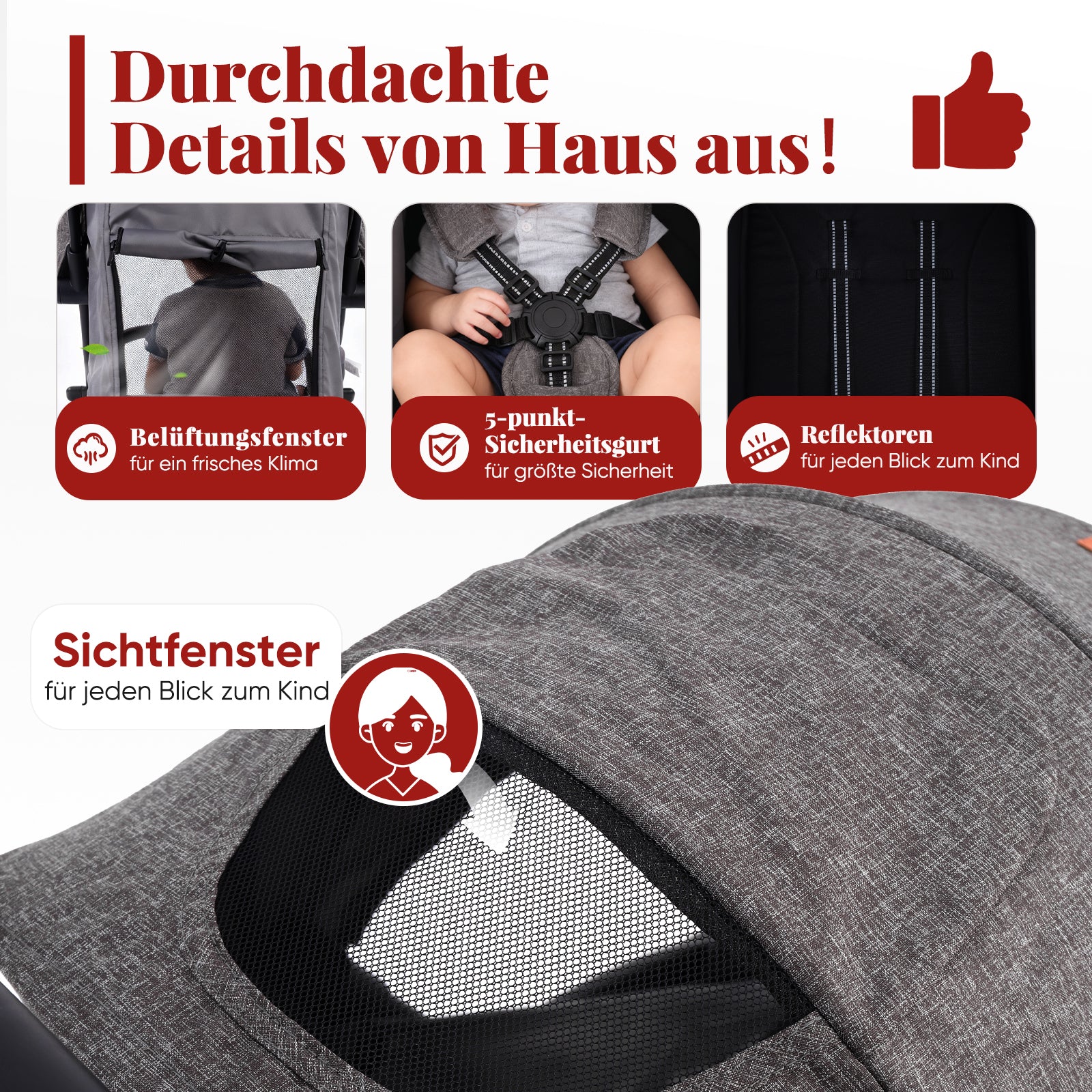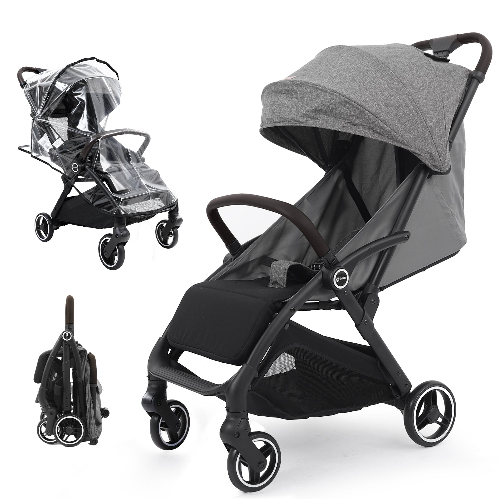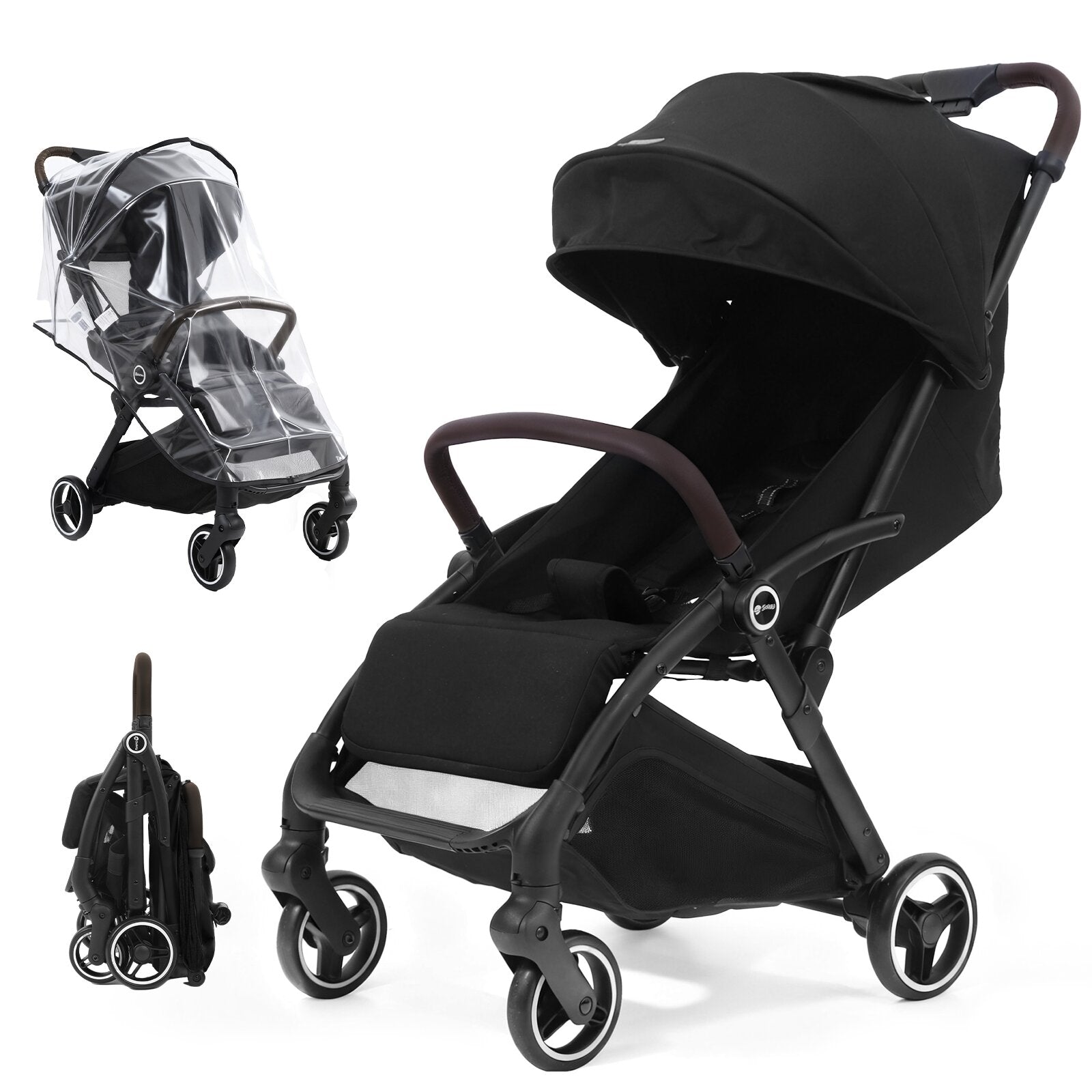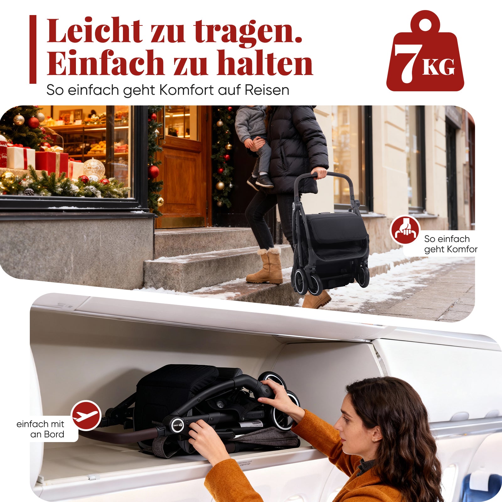 Der Kinderwagen lässt sich mit nur einer Hand öffnen oder zusammenklappen – ideal, wenn Sie Ihr Baby tragen oder viel unterwegs sind. Kompakt gefaltet passt er problemlos in Flugzeug-Handgepäckfächer oder in kleine Kofferräume.