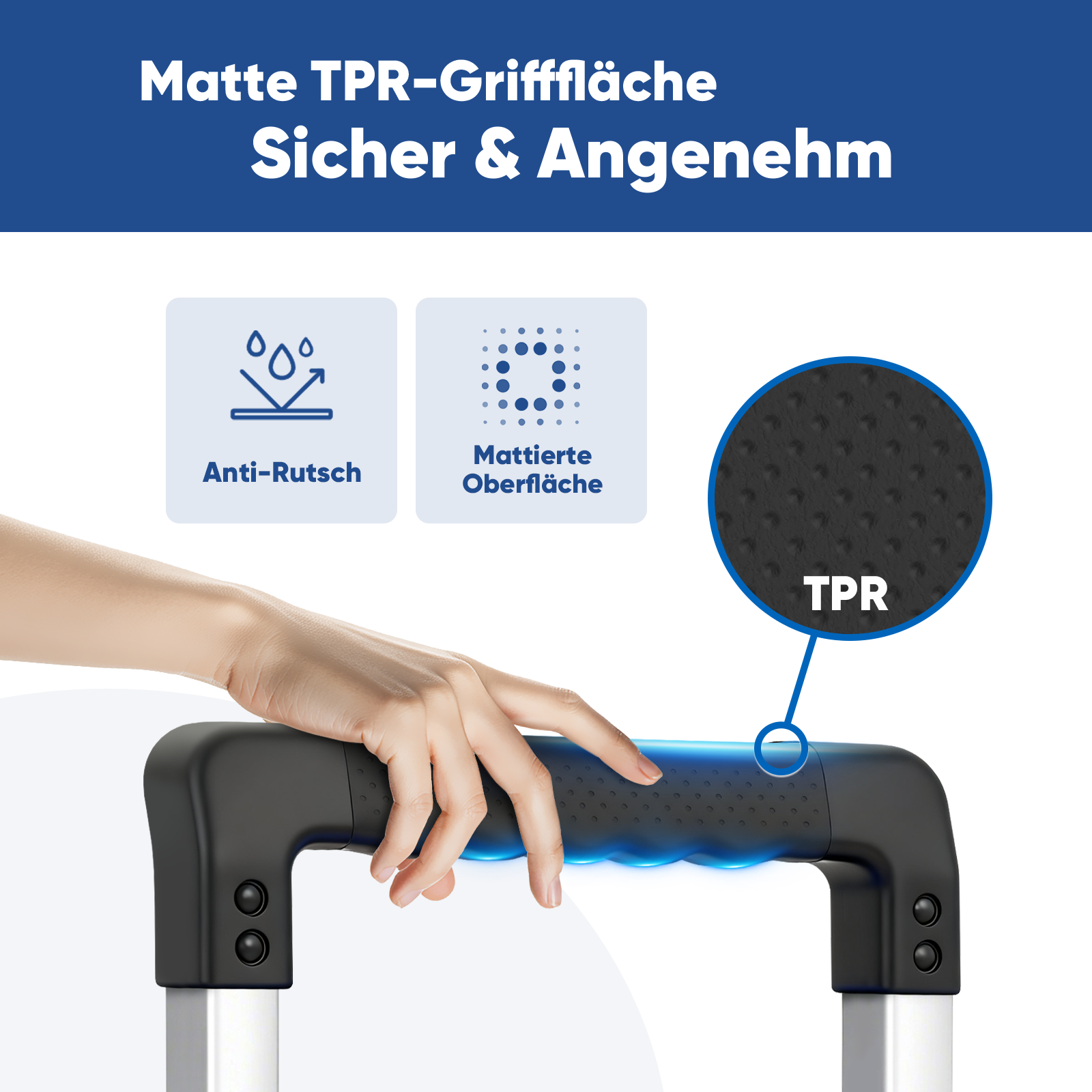 Die hochwertigen, großdimensionierten TPR-Räder laufen bis zu 30 % leiser und sind dreimal langlebiger als Standardräder. Sie bieten hervorragende Stabilität auf glatten, unebenen oder rauen Untergründen.