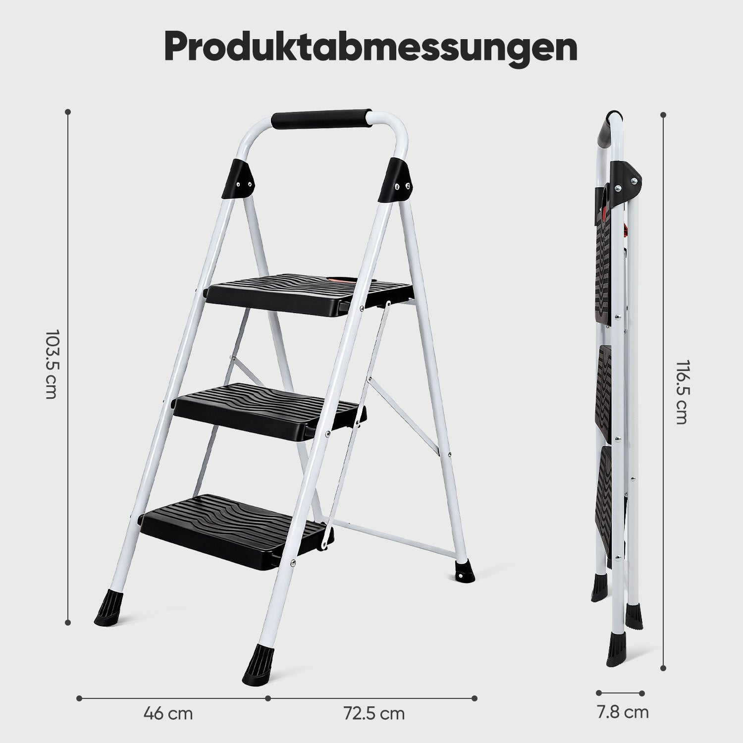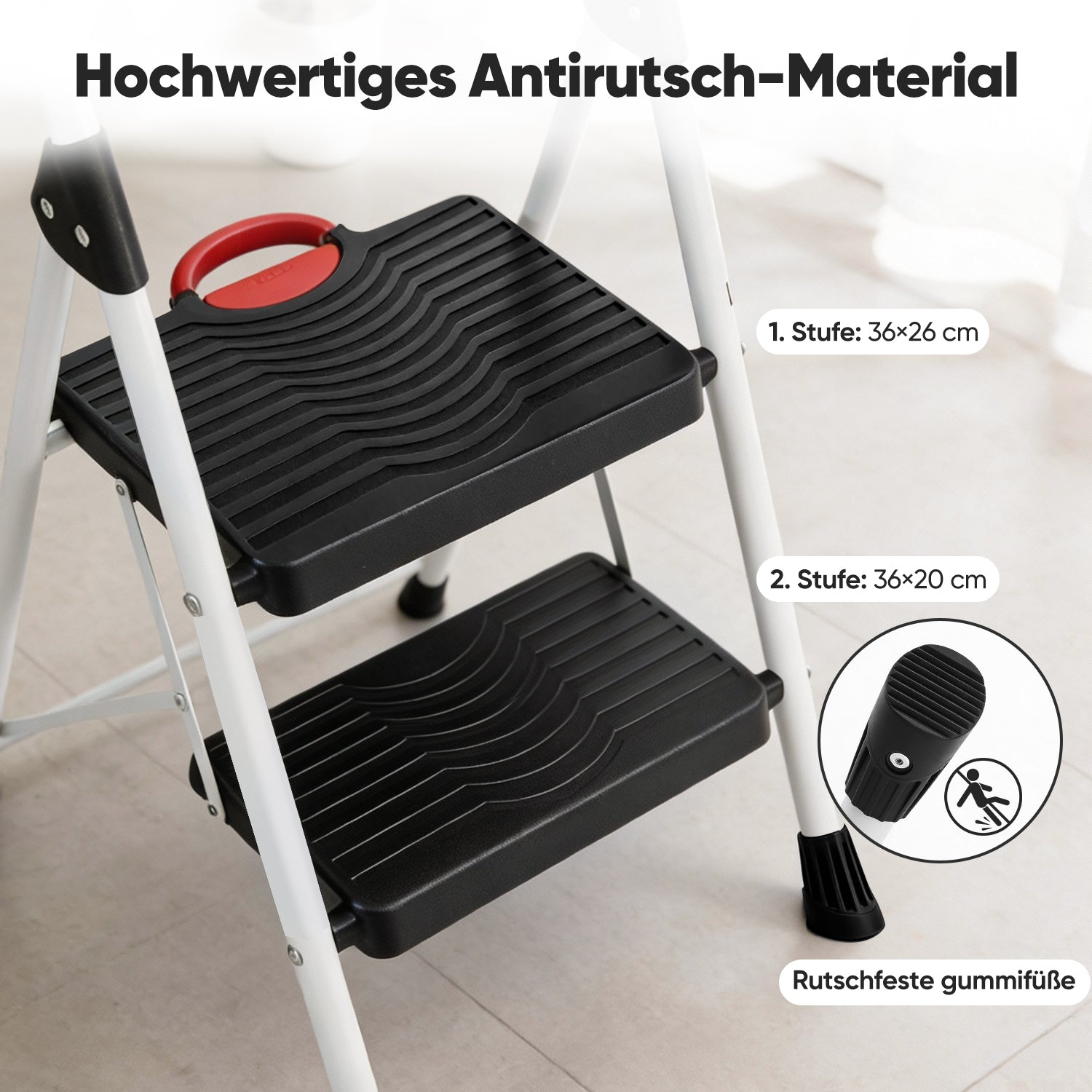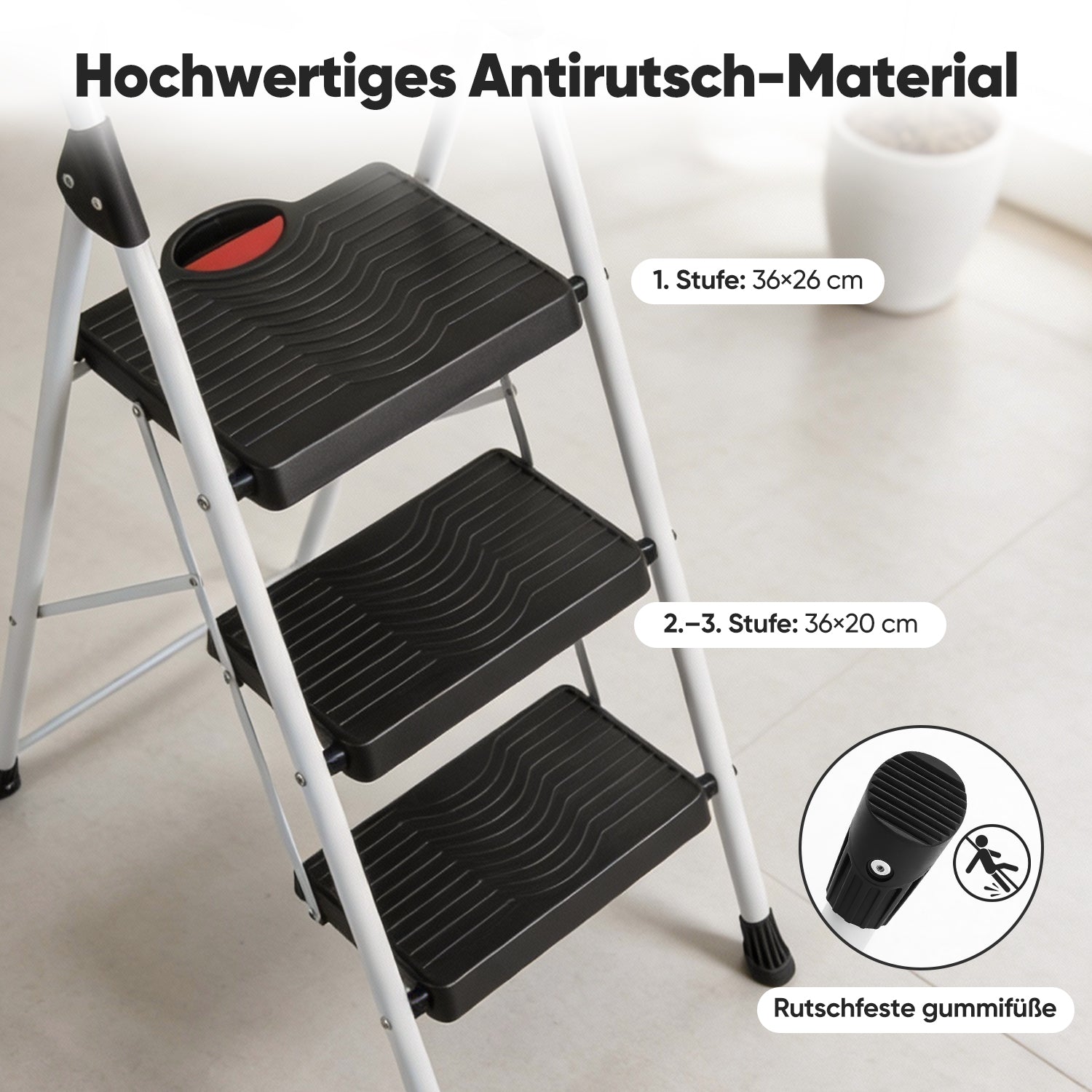 Für zusätzlichen Komfort sorgen die breiten Kunststoffstufen mit rutschfester Oberfläche. Sie bieten ein angenehmes, sicheres Trittgefühl – ideal auch bei häufiger Nutzung. Eine leicht bedienbare Sicherheitsverriegelung verhindert ein unbeabsichtigtes Zusammenklappen während des Gebrauchs.