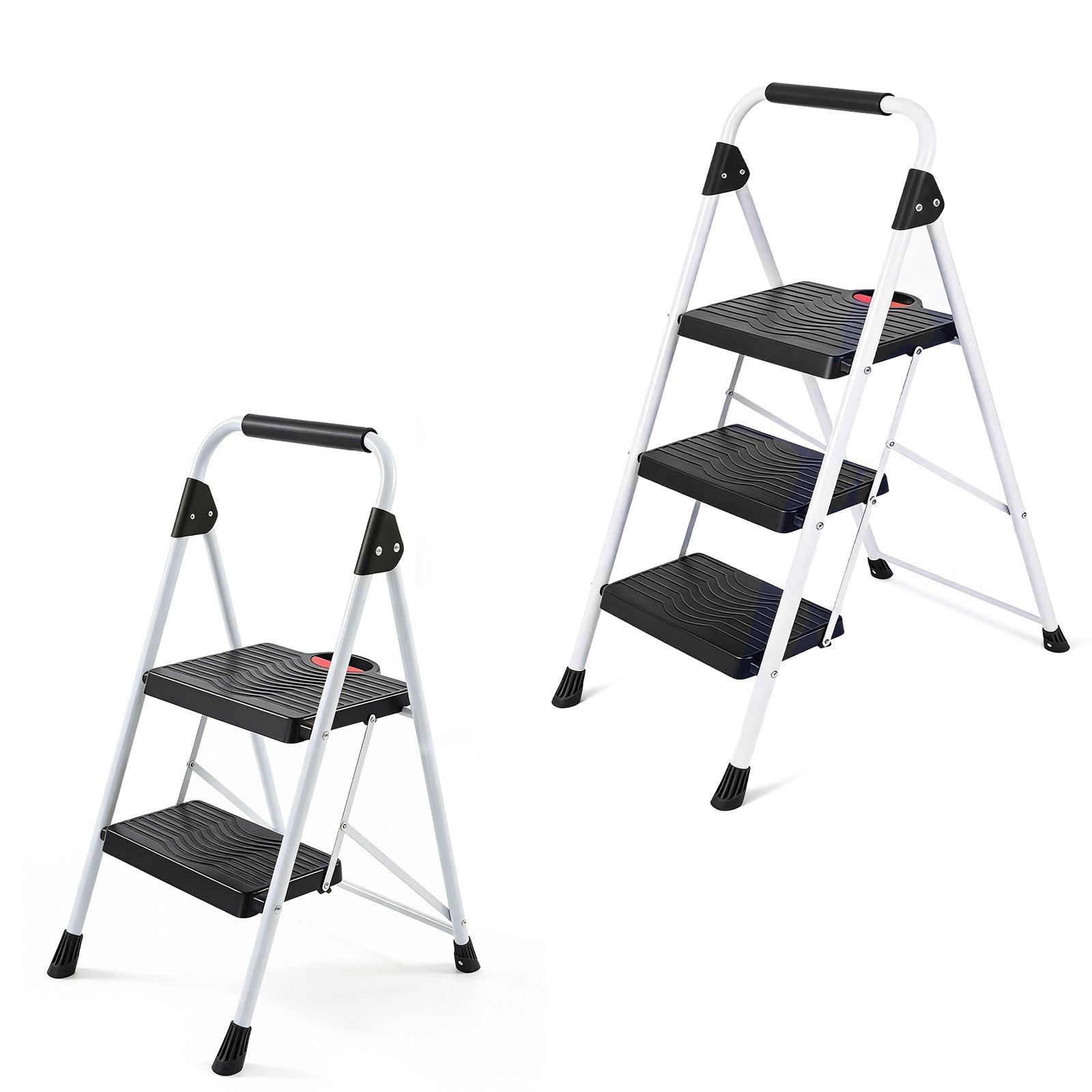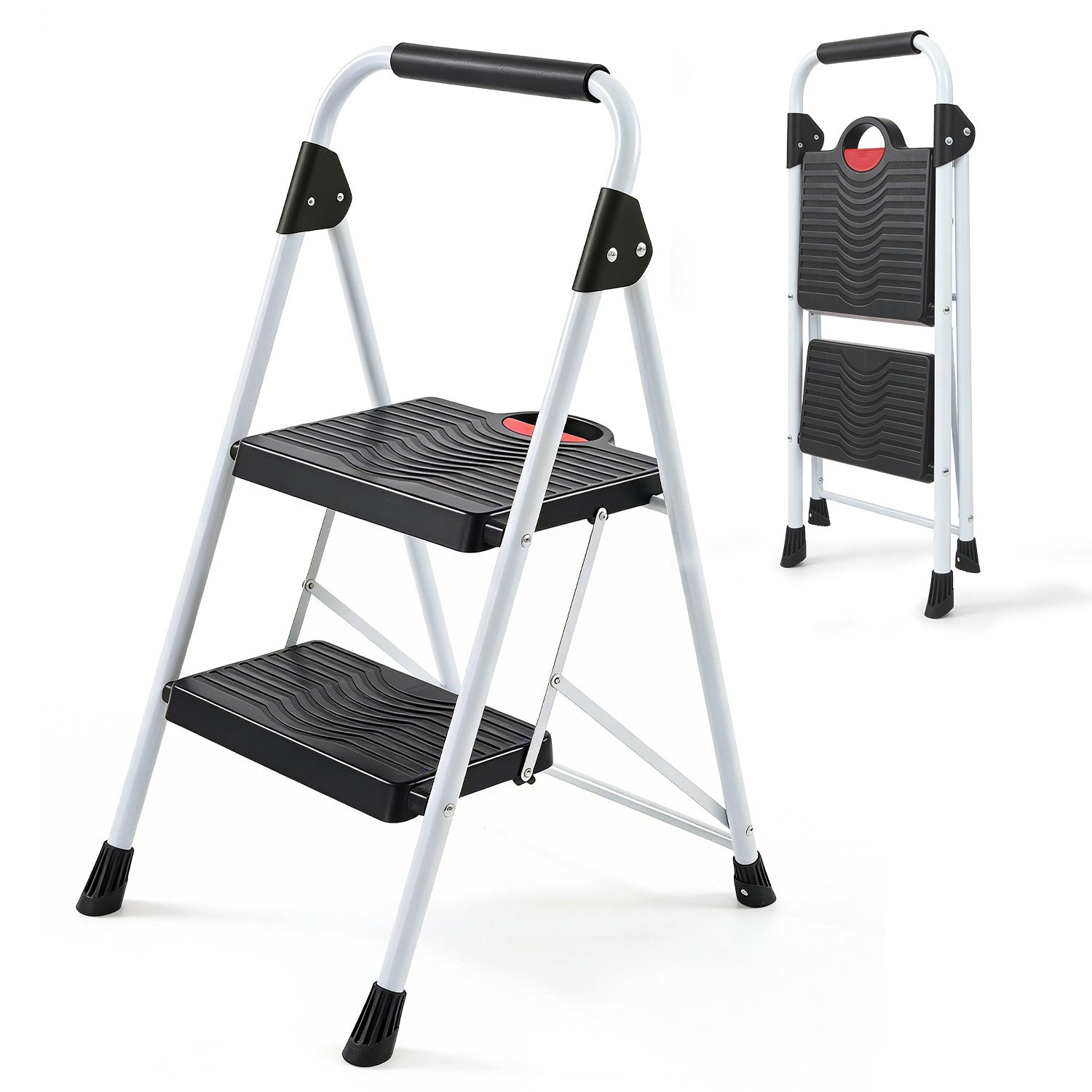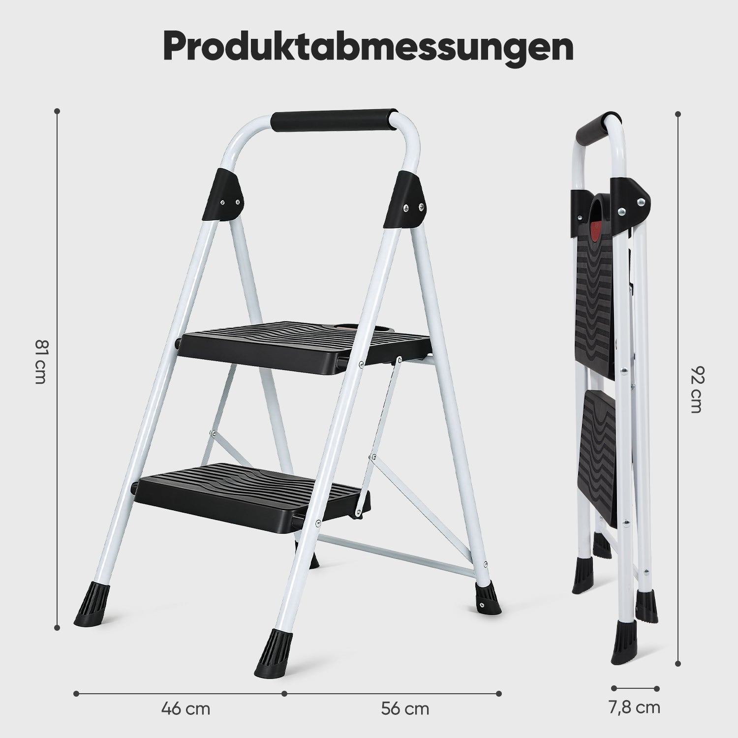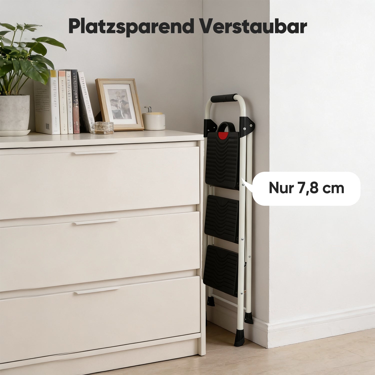 Für zusätzlichen Komfort sorgen die breiten Kunststoffstufen mit rutschfester Oberfläche. Sie bieten ein angenehmes, sicheres Trittgefühl – ideal auch bei häufiger Nutzung. Eine leicht bedienbare Sicherheitsverriegelung verhindert ein unbeabsichtigtes Zusammenklappen während des Gebrauchs.