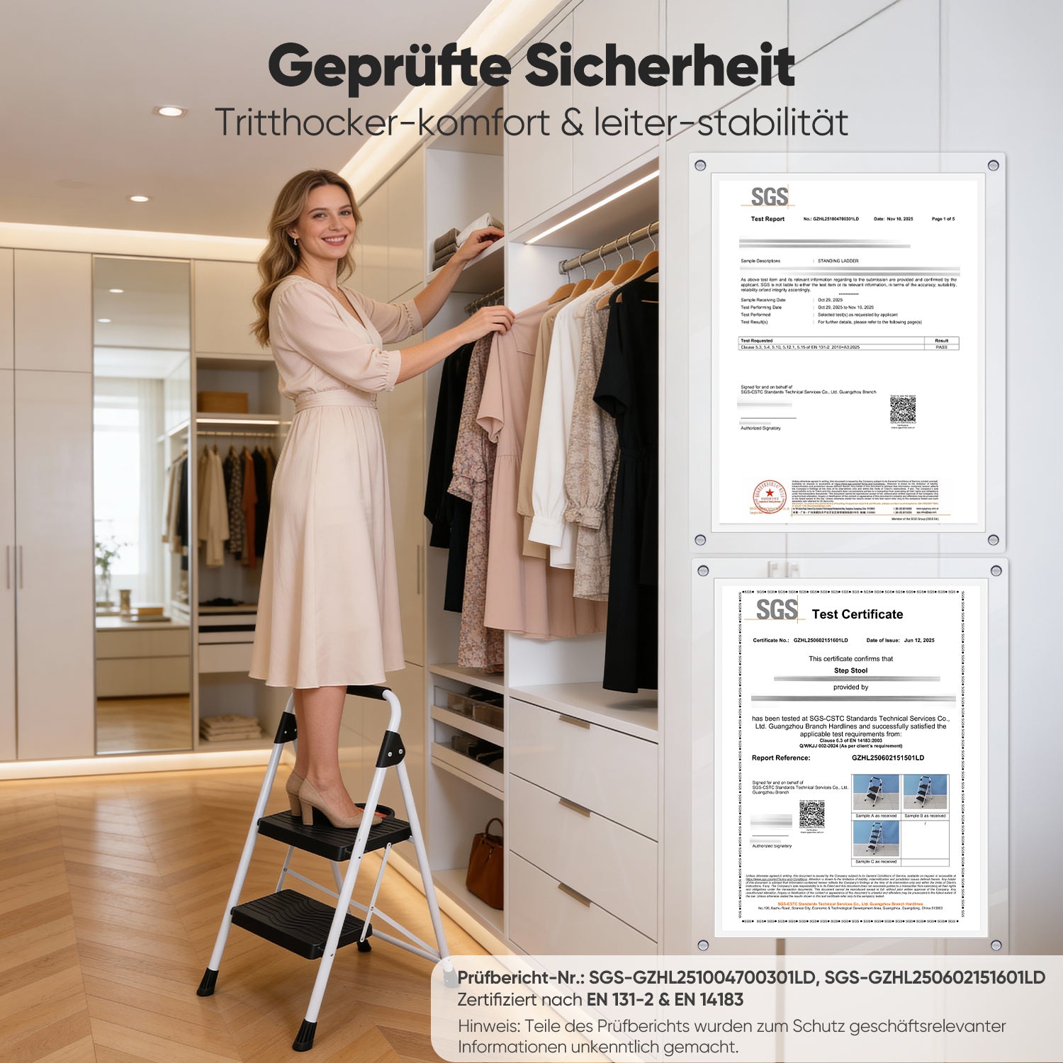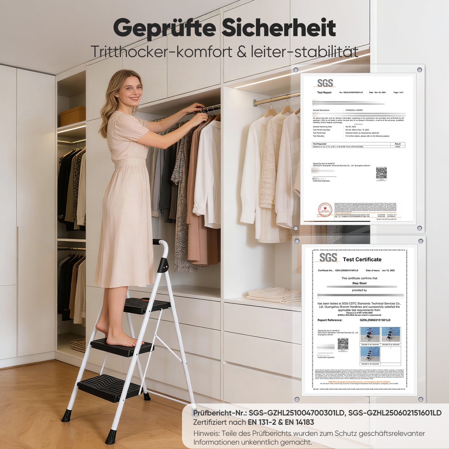 Die Leiter ist doppelt zertifiziert nach SGS EN 131-2 und EN 14183 und erfüllt damit die europäischen Sicherheitsstandards für Haushaltsleitern. Mit einer Tragkraft von bis zu 150 kg bietet sie zuverlässige Stabilität für den täglichen Gebrauch.