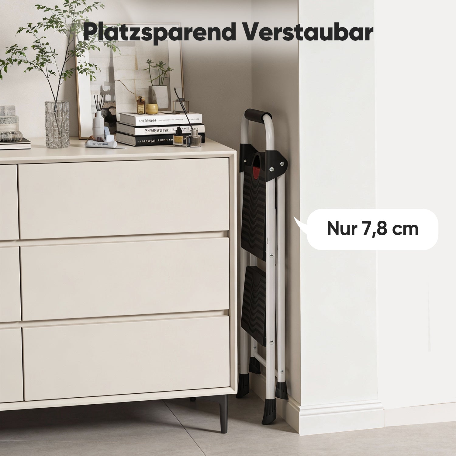 Die verschraubten Gummifüße gewährleisten rutschfesten Halt auf verschiedenen Bodenbelägen und schützen empfindliche Böden vor Kratzern. Zusammengeklappt ist die Leiter nur ca. 7,8 cm schmal und lässt sich problemlos hinter Türen oder neben Schränken verstauen.
