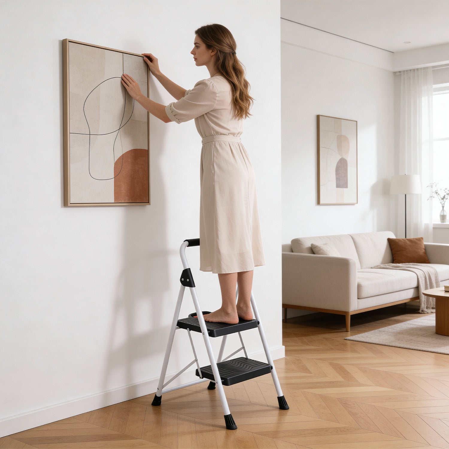 Die Sekey Trittleiter wird komplett vormontiert geliefert und ist sofort einsatzbereit. Erhältlich in 2 Stufen (Höhe ca. 80 cm) oder 3 Stufen (Höhe ca. 100 cm) – passend für unterschiedliche Reichweiten und Anforderungen im Haushalt.