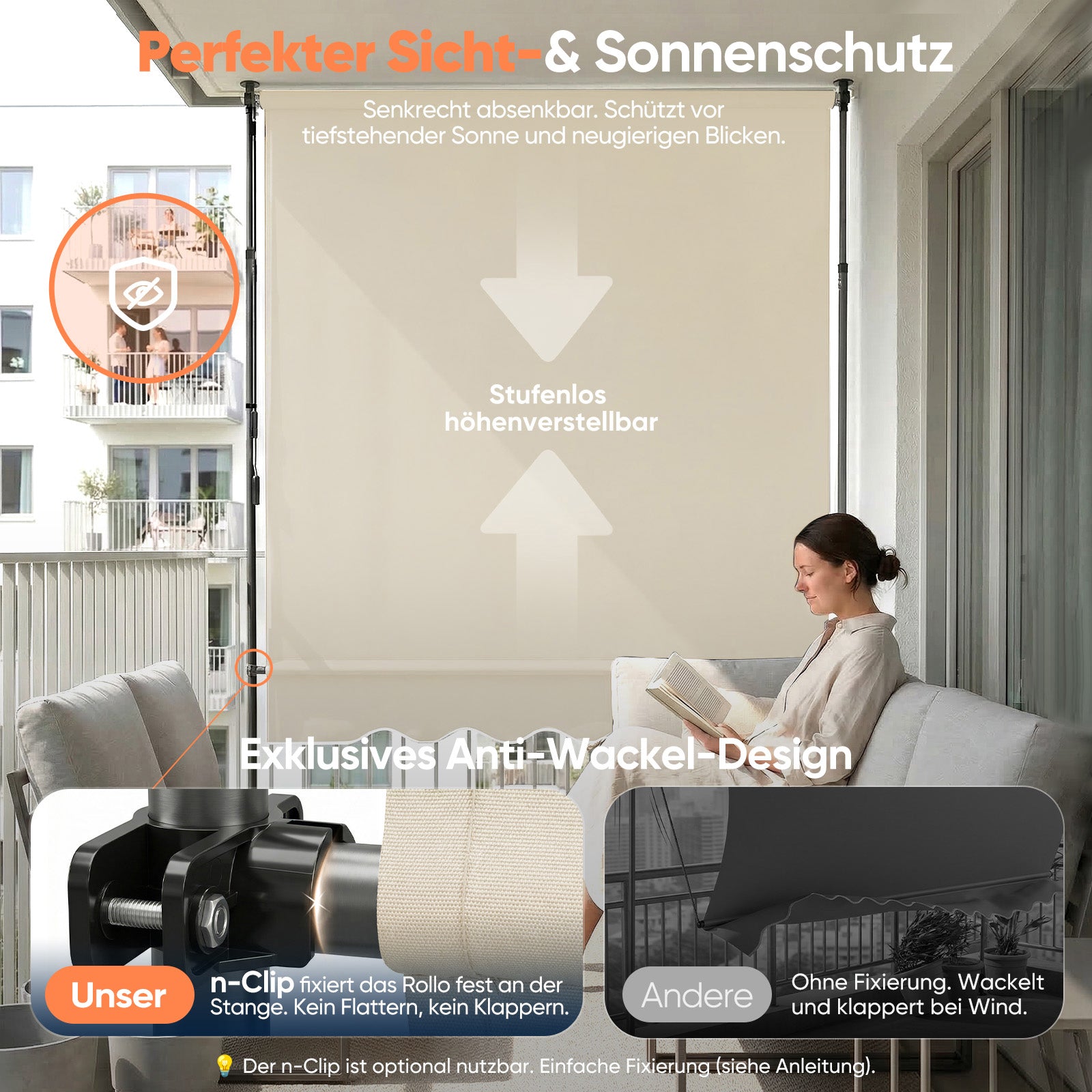 Auch vertikal als Sichtschutz nutzbar – für mehr Privatsphäre auf dem Balkon. Der innovative n-Clip fixiert die untere Stange und reduziert Flattern sowie störende Geräusche bei Wind.