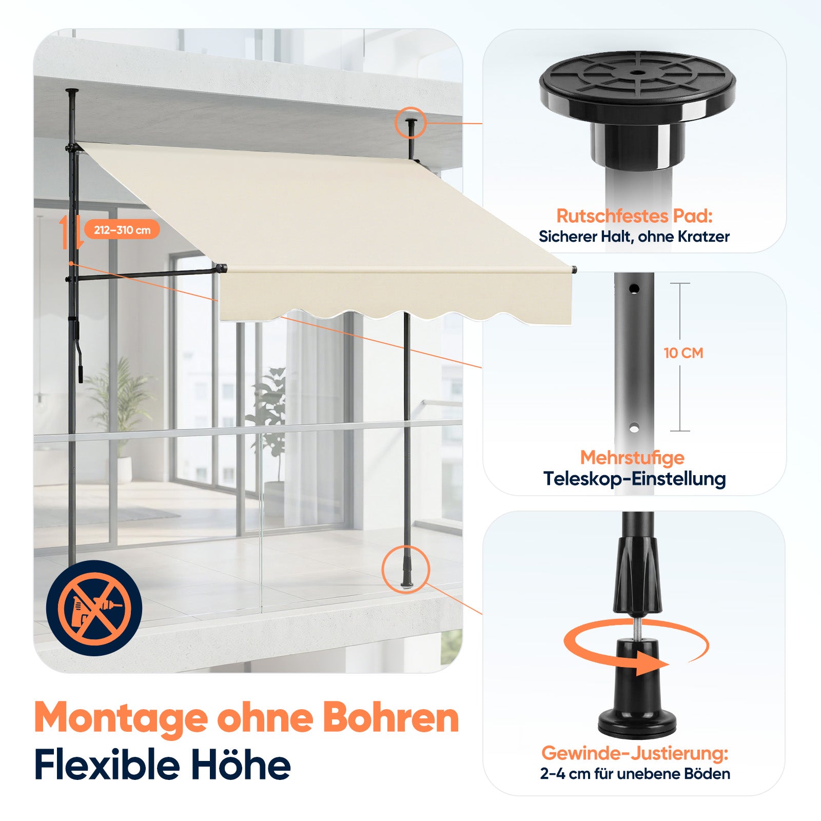 Die Markise wird mit stabilen Teleskopstangen zwischen Boden und Decke befestigt. Kein Bohren notwendig – keine Schäden an Wänden oder Fassade. Dank vormontierter Mechanik gelingt der Aufbau schnell und unkompliziert (ca. 30 Minuten zu zweit).