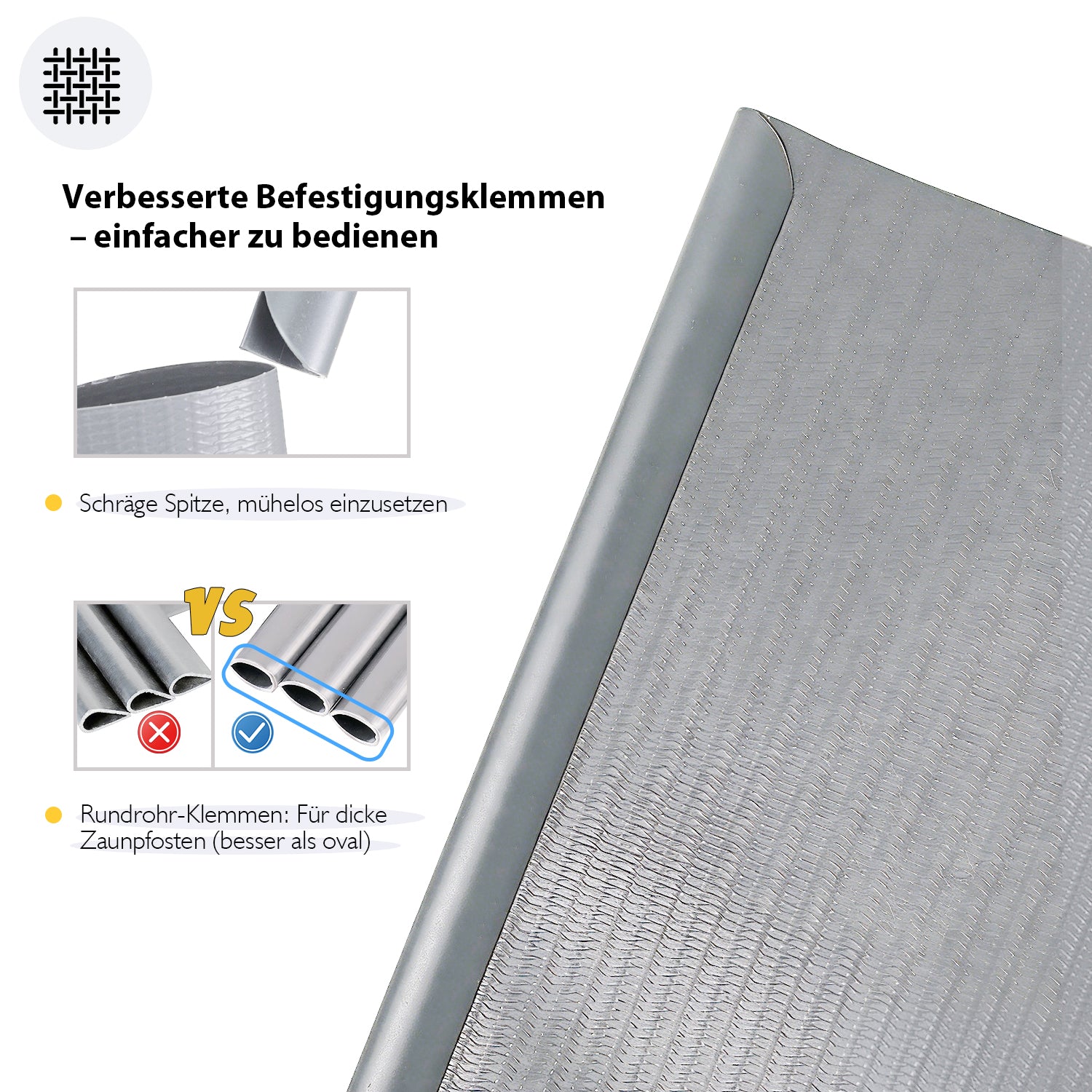 Für eine besonders einfache Installation werden verbesserte Befestigungsclips mitgeliefert. Das ovale Design sorgt für einen besseren Halt bei dickeren Sichtschutzstreifen als herkömmliche flache Clips. Dank der leicht spitzen Enden lassen sich die Clips schnell und mühelos in das Doppelstabgeflecht einsetzen, wodurch die Montage unkompliziert und zeitsparend ist.