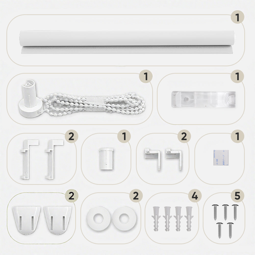 Lieferumfang: 1 x Verdunkelungsrollo, 1 x Montage-Set (Klemmträger + Schraubenset), 1 x Benutzerhandbuch.