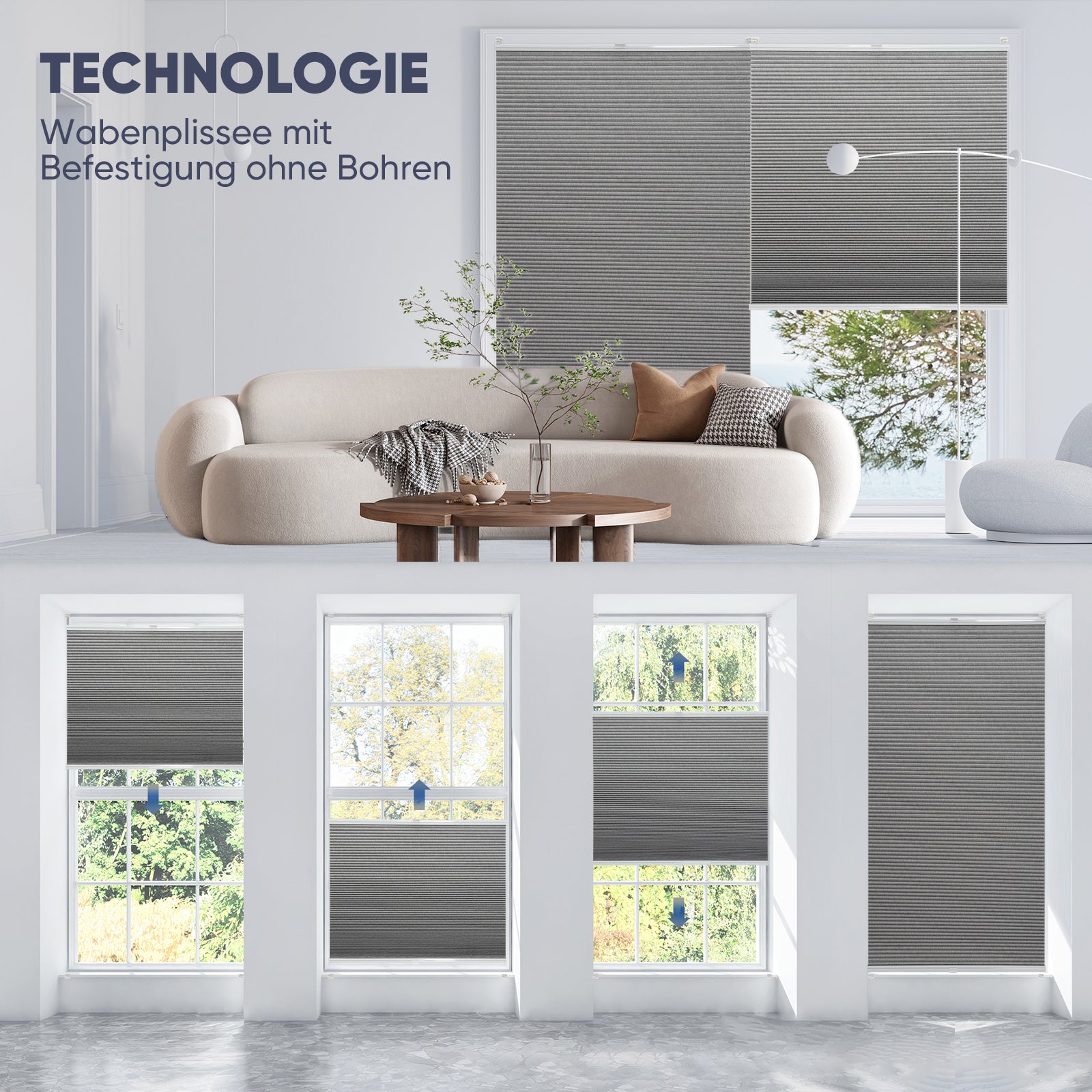 Das Sekey Wabenplissee lässt sich mithilfe verstellbarer Klemmhalter direkt am Fensterrahmen befestigen – ganz ohne Bohren. Die moderne Textiloptik in Grau wirkt ruhig, zeitlos und fügt sich harmonisch in unterschiedliche Wohn- und Arbeitsbereiche ein.