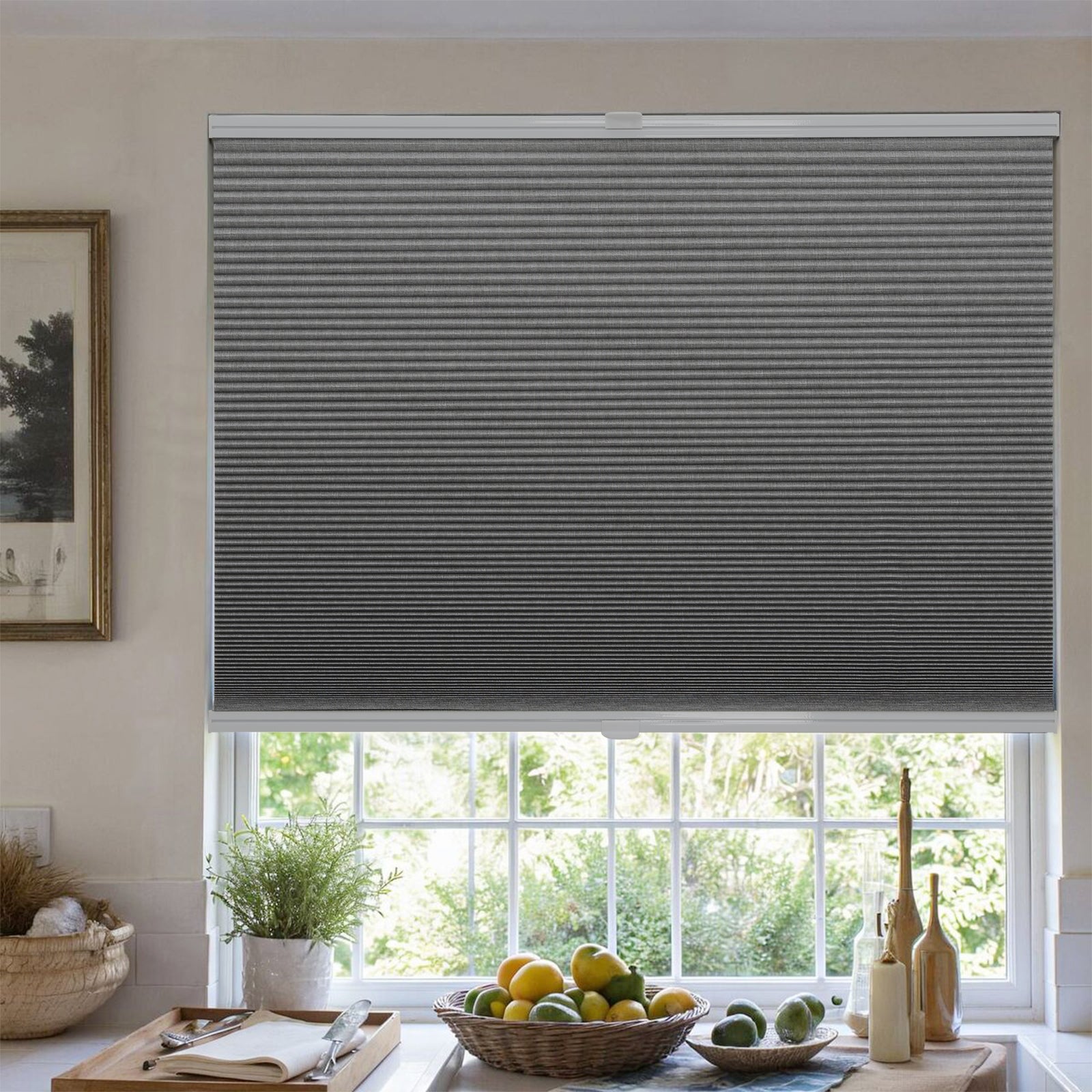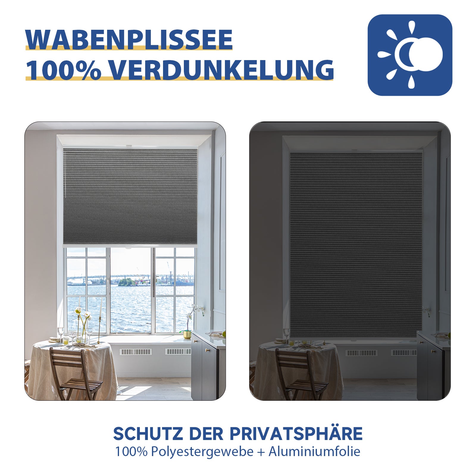 Die Kombination aus Wabenstruktur, Aluminiumschienen und Polyestergewebe mit integrierter Folie sorgt für eine zuverlässige 100 % Verdunkelung. Licht, UV-Strahlen und Hitze werden effektiv reduziert, während die blickdichte Struktur für Privatsphäre sorgt.
