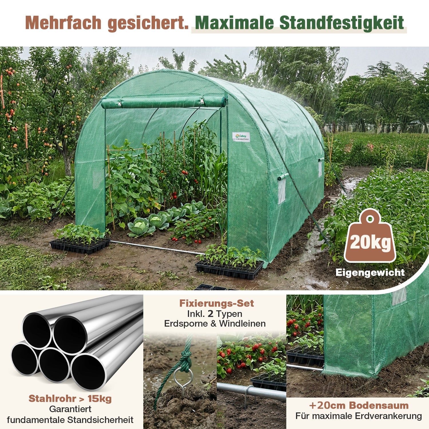 Mit über 20 kg Eigengewicht, einem 20 cm verlängerten Bodensaum zur Erdverankerung sowie XXL U-Heringen, Spiral-Erdankern und verstärkten Windleinen bleibt der Folientunnel auch bei starkem Wind sicher an seinem Platz.