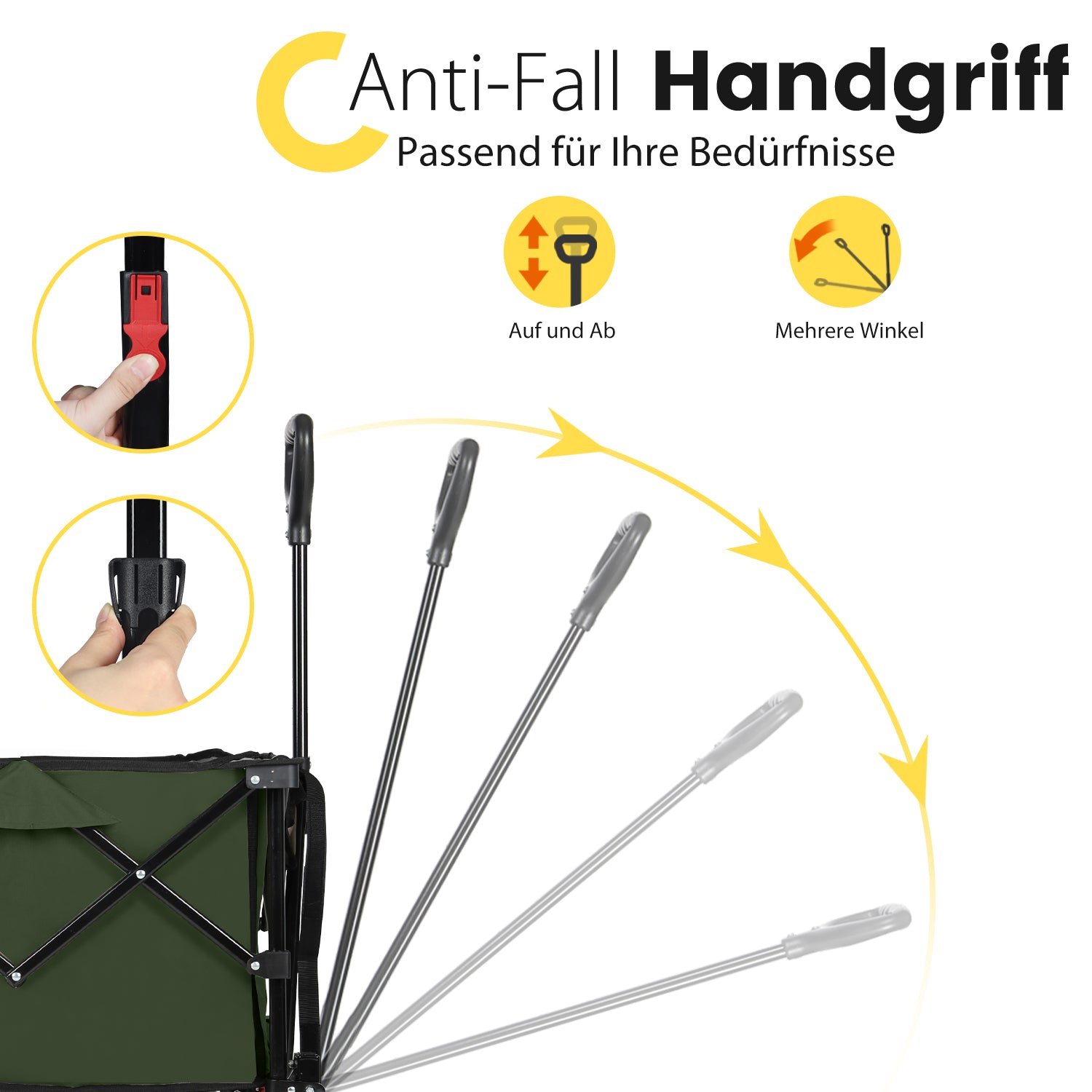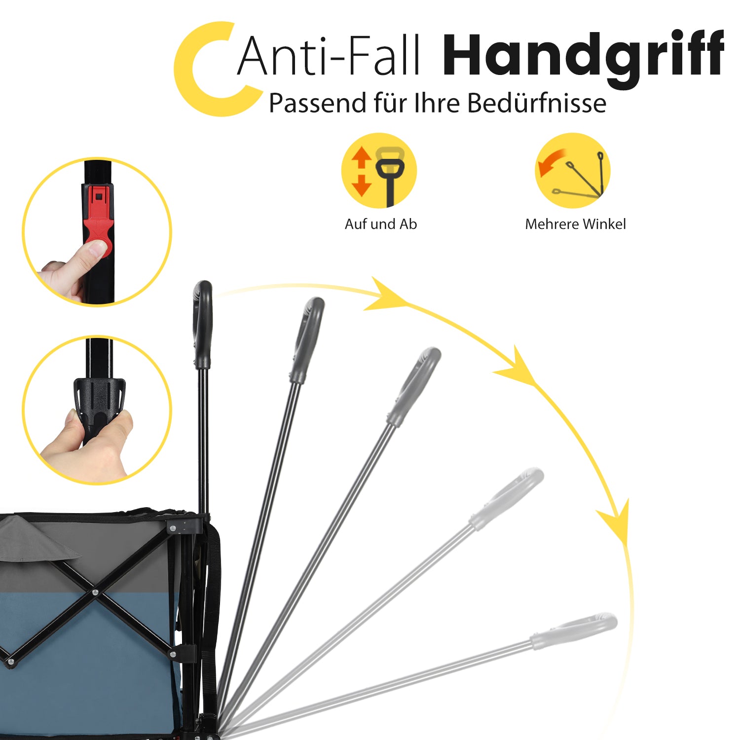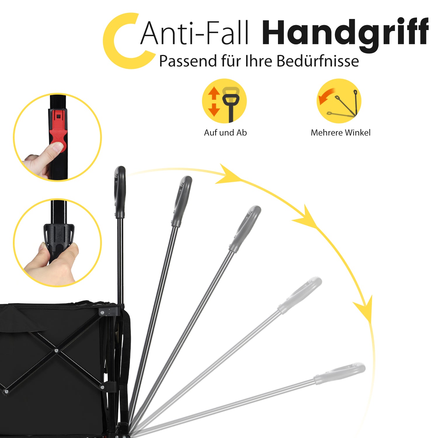 Dank des patentierten 4-Wege-Faltmechanismus kann der Bollerwagen aus allen Richtungen zusammengefaltet werden und lässt sich mühelos mit nur einer Hand bedienen. Im zusammengeklappten Zustand benötigt er nur minimalen Stauraum und passt problemlos in den Kofferraum oder die Garage.