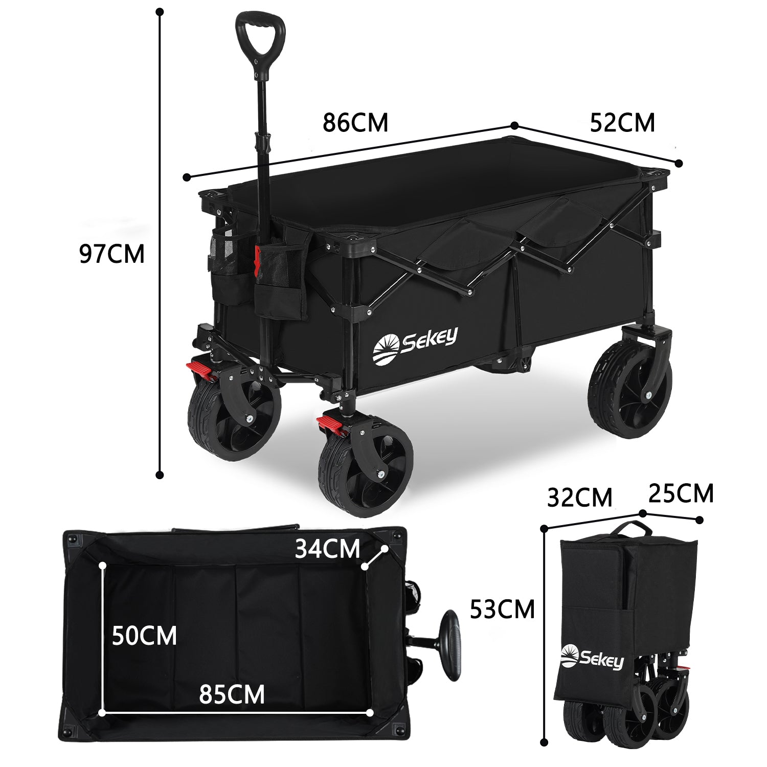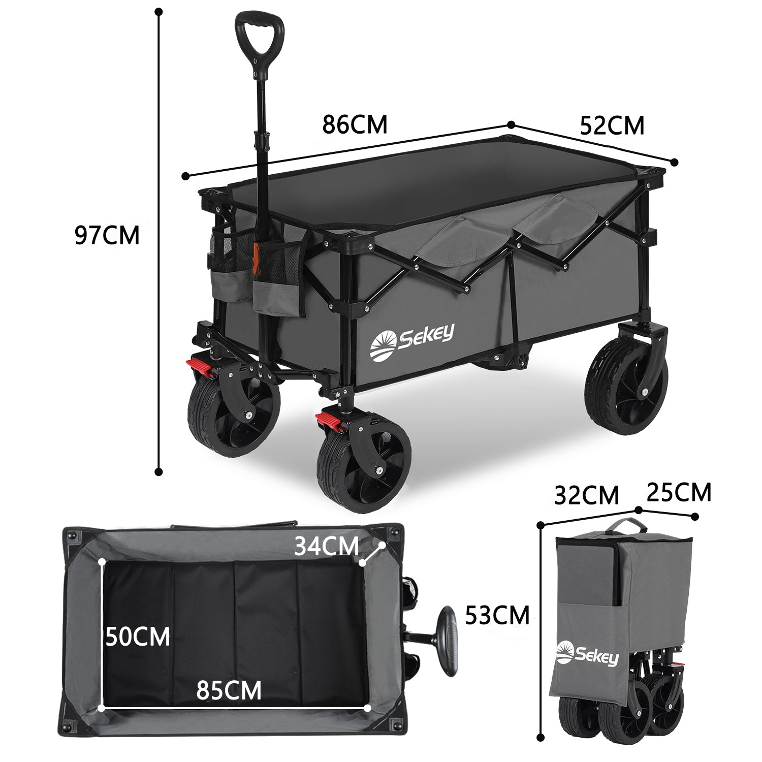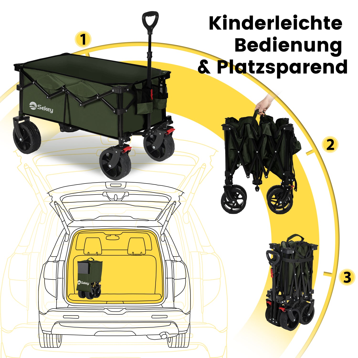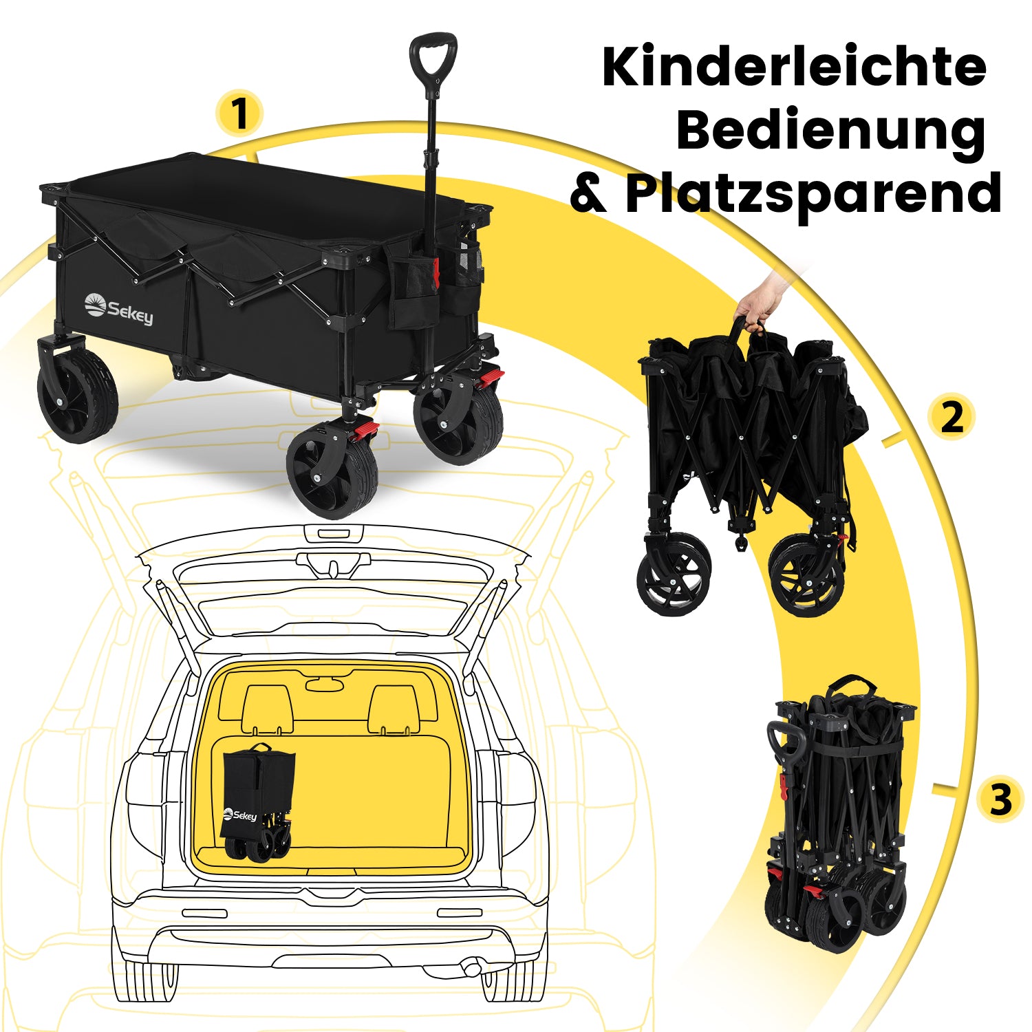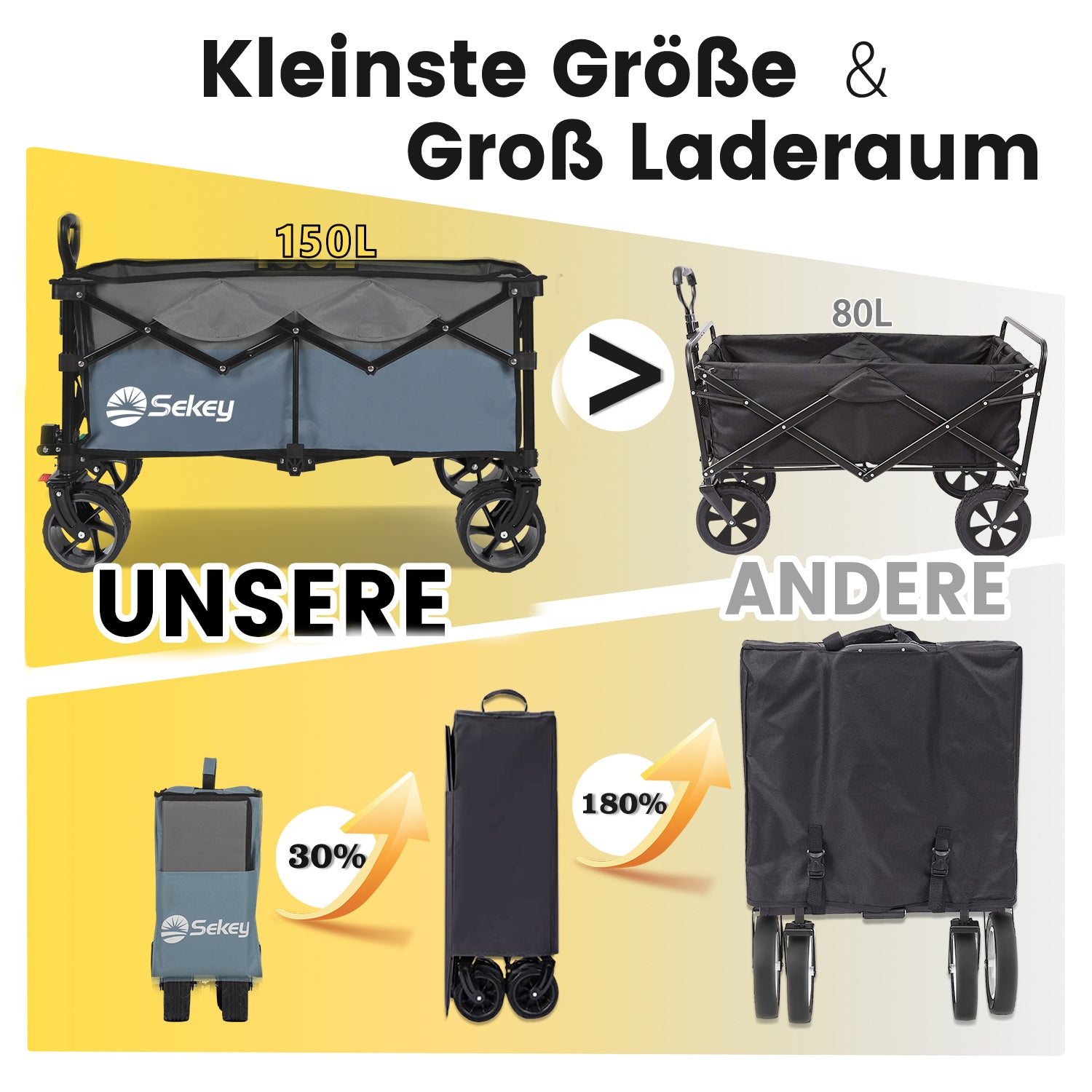 Der Sekey XXL Bollerwagen 4020 ist die ideale Transportlösung für Camping, Strand, Garten, Festivals oder den Familienalltag. Mit einem großzügigen Ladevolumen von 150 Litern und einer Tragkraft von bis zu 150 kg bietet er ausreichend Platz für Einkäufe, Gepäck oder Outdoor-Ausrüstung – und lässt sich dennoch besonders kompakt verstauen.