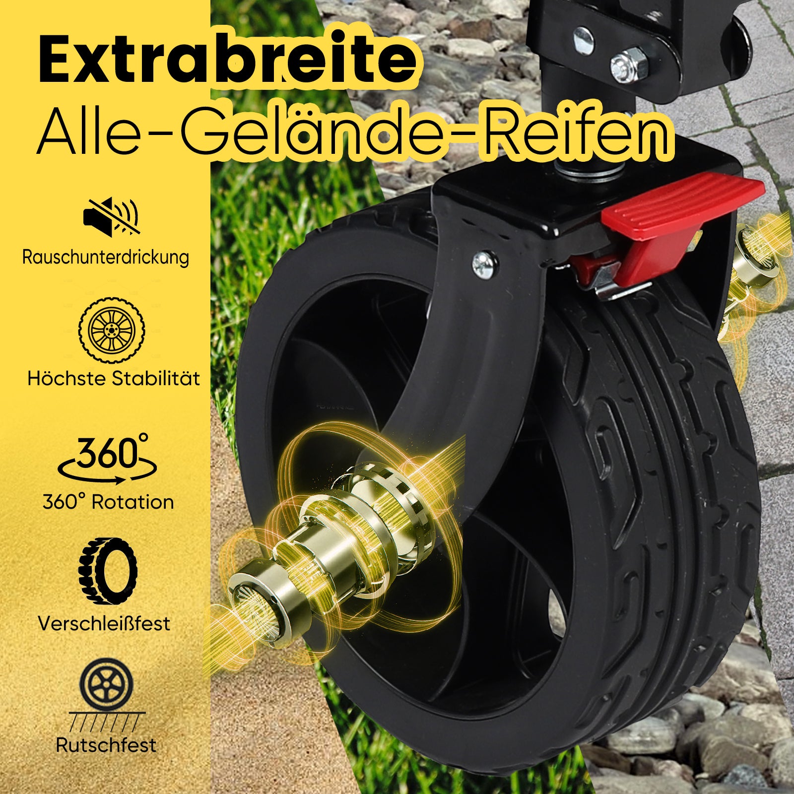 Die 7 Zoll breiten All-Terrain-Reifen sorgen für eine ruhige und stabile Fahrt auf unterschiedlichsten Untergründen – ob Sand, Schotter, Wiese oder Asphalt. Integrierte Bremsen und geräuschlose Lager erhöhen Sicherheit und Komfort beim Ziehen oder Abstellen.