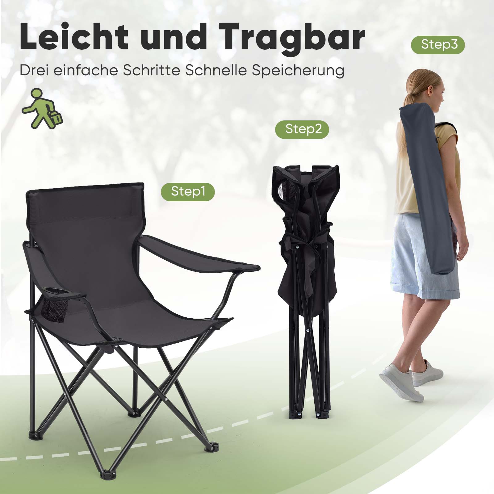 Im Lieferumfang enthalten ist 1 Campingstuhl in elegantem Schwarz. Aus robustem Oxford-Stoff und stabilem Stahlrohr gefertigt, bringt der Stuhl nur 1,65 kg auf die Waage – perfekt zum Mitnehmen. Inklusive farblich passender Tragetasche für einfachen Transport.