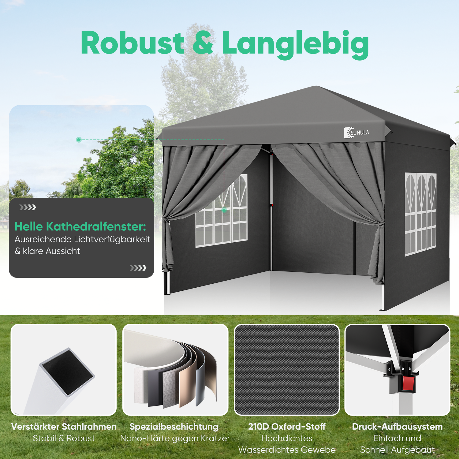 Für maximale Standfestigkeit sorgen verdickte Standbeine und Querstreben mit robuster, kratzfester Beschichtung. In Kombination mit den mitgelieferten Sandsäcken, Heringen und Abspannseilen bleibt der Pavillon auch bei Wind sicher an seinem Platz – ideal für den ganzjährigen Einsatz.