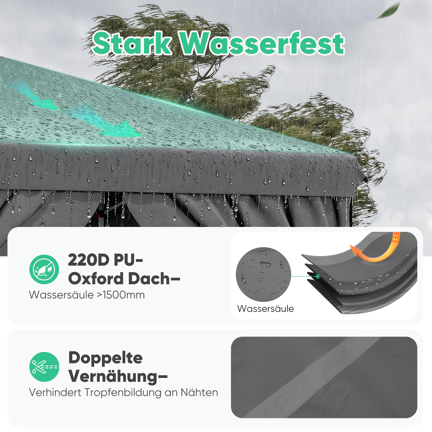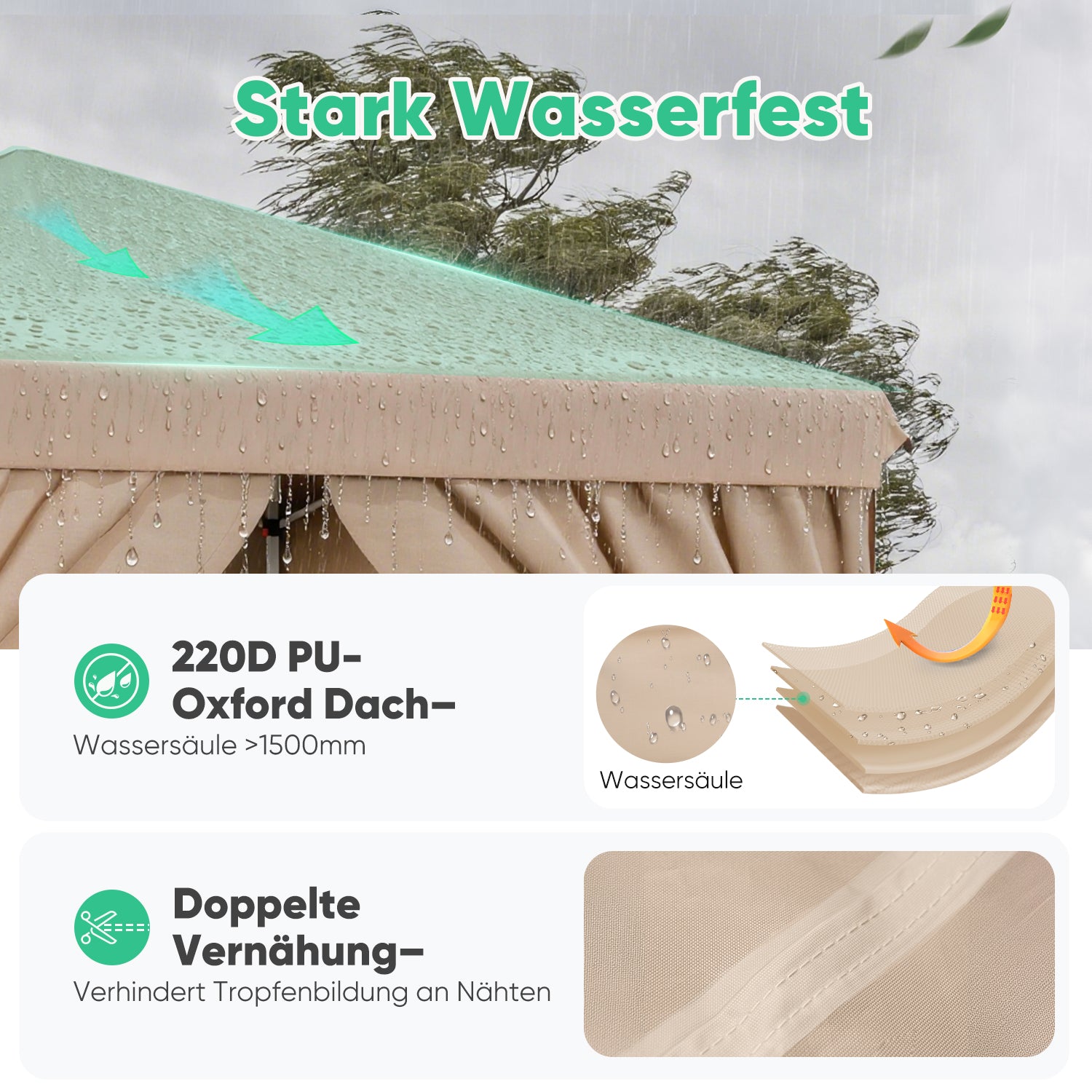 Das strapazierfähige 220D Oxford-Gewebe mit UPF 50+ und heißversiegelten Nähten schützt zuverlässig vor Regen, Sonne und UV-Strahlen. Die 4 Seitenwände bieten zusätzlichen Windschutz und Privatsphäre.